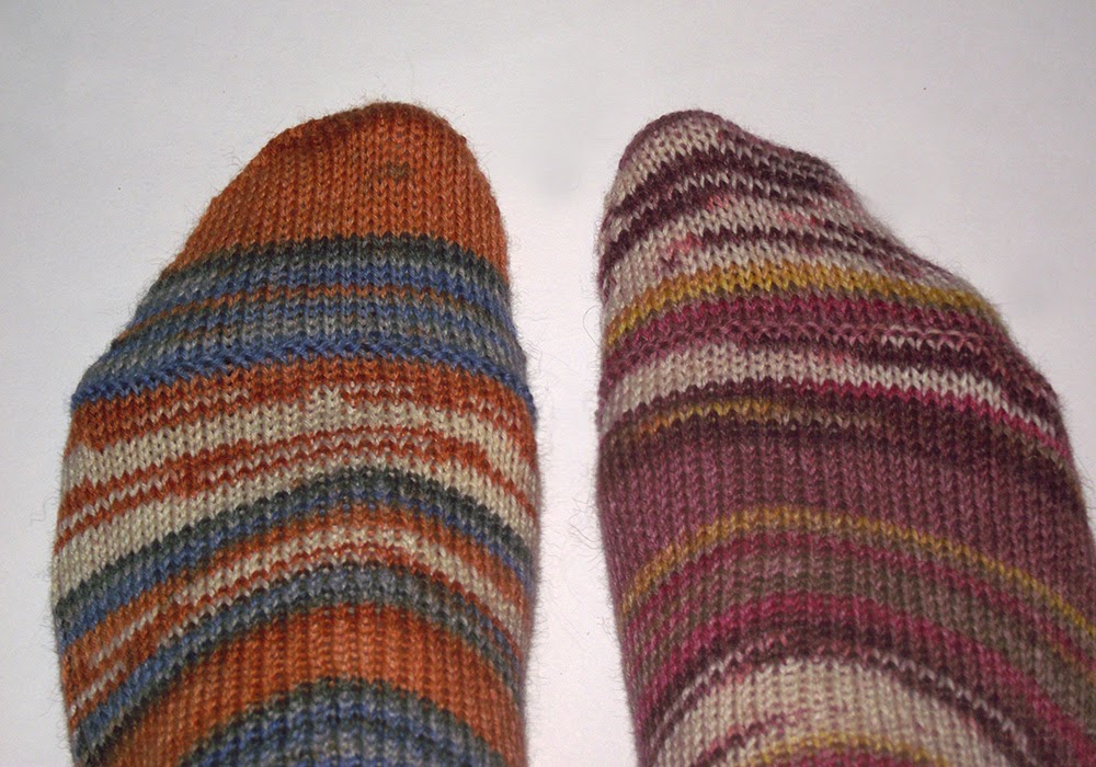 С египетской стопой принцип расчета убавок тот же, но мысок мы формируем асимметричным. Минусы - сложнее рассчитывать, требуется внимательность при выполнении, чтобы не получить два левых или два правых носка, и при надевании надо быть внимательным, чтобы не перепутать - не зря же вы старались и делали носки разными))