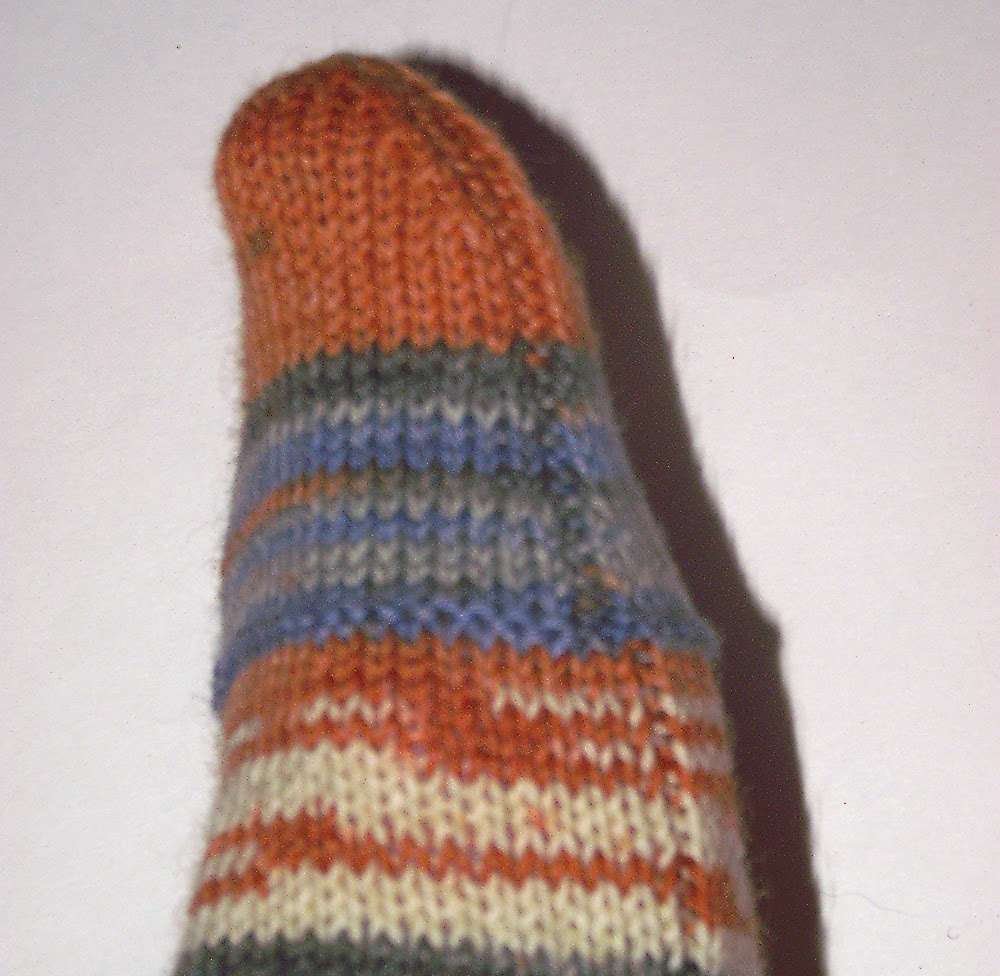 А вот что происходит с римским мыском, если его одеть на египетскую стопу... Вязаное полотно, несомненно, эластично и примет форму ноги, особенно со временем. Но неизбежно искажение рисунка (представьте, что будет на жаккардовых полосах) и провисание мыска (пузырь) по линии от большого пальца к мизинцу, где образуется излишек полотна.
