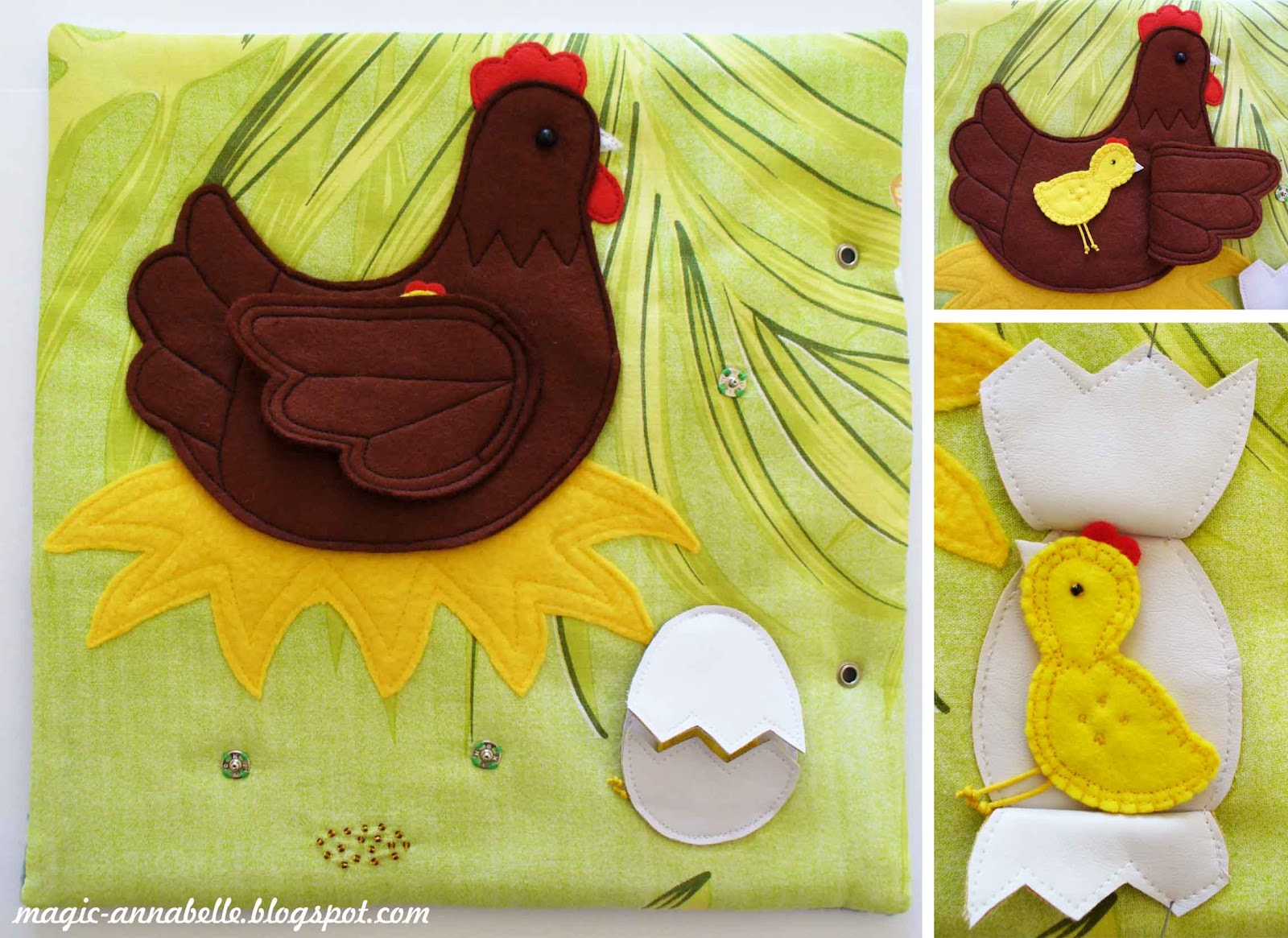 Курочка, яички, цыплятки. На этой страничке тренируем пришивные кнопки, их тут 5, т.е. цыплята могут быть прикреплены в 5 разных местах. Курочка и цыплята из фетра, яички из искусственной кожи.