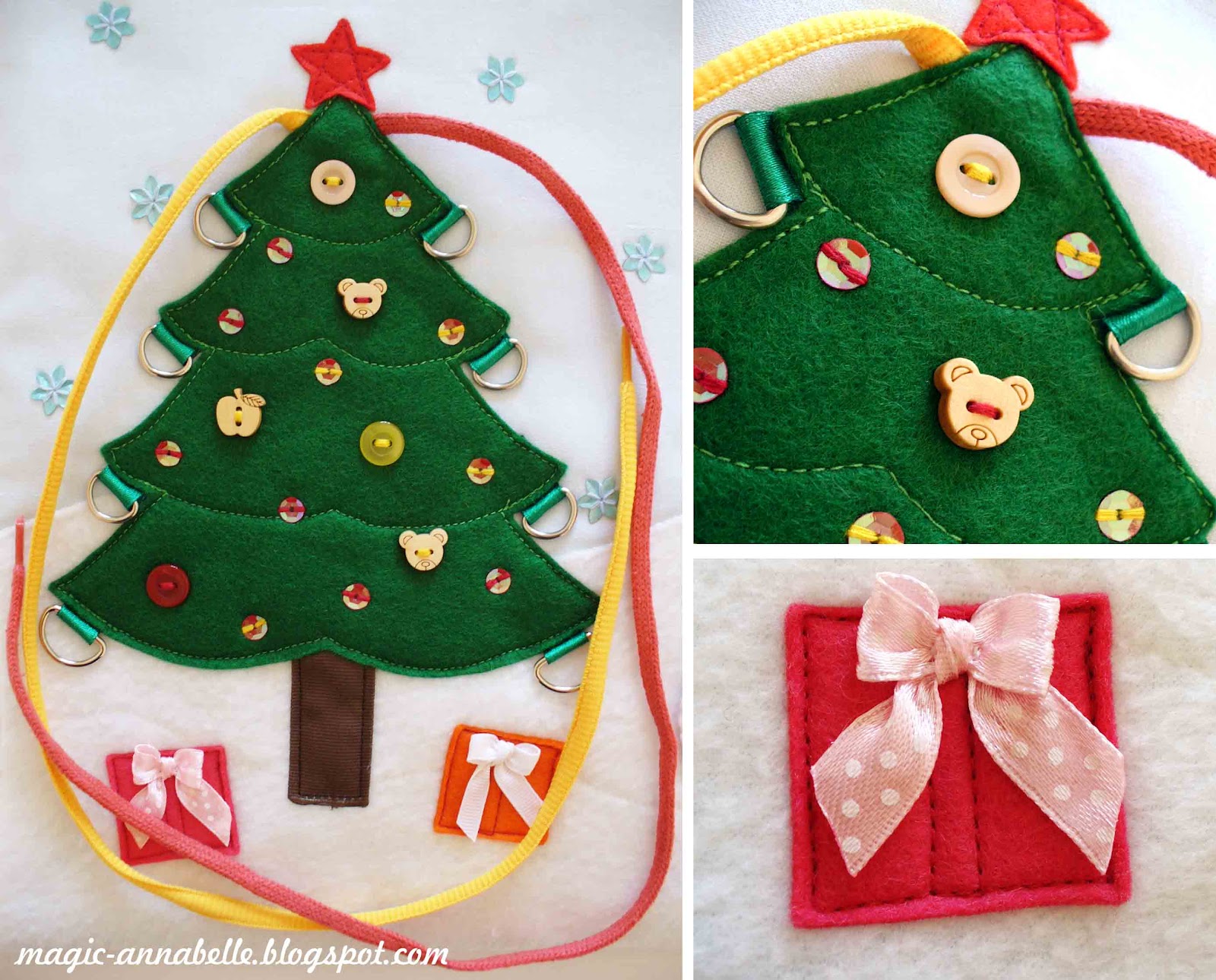 В небе снежинки - пайетки. К ёлочке пришиты 2 шнура и 8 полуколец, можно опробовать различные виды шнуровки.