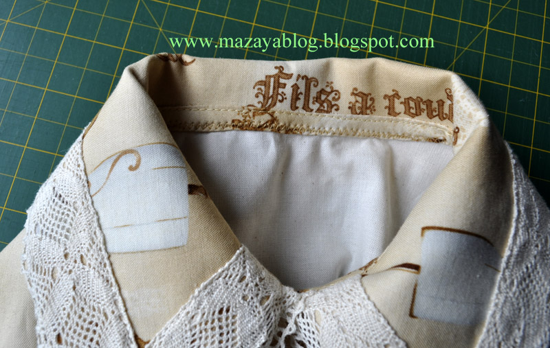 Выкраиваем полоску по косой, прикладываем поверх воротника и пришиваем