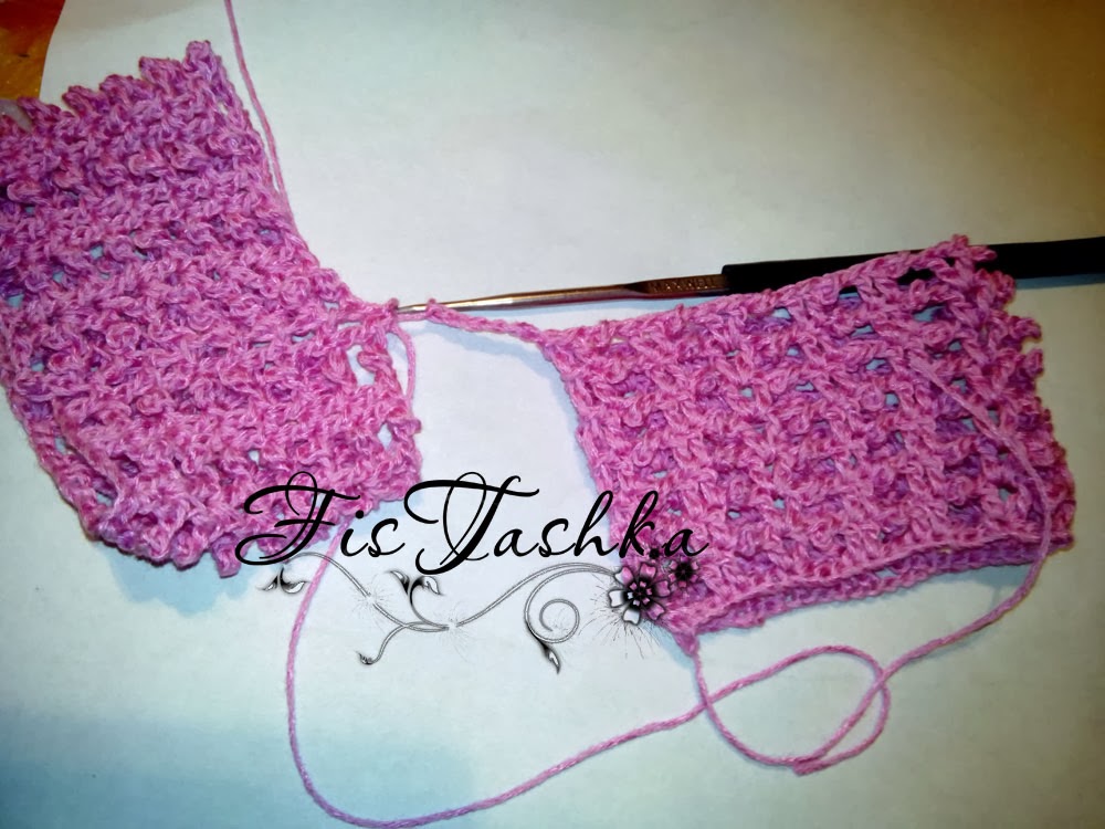 Делаем цепочку из 85 вп и вяжем по схеме, вначале совместно полочки и спинку и заканчиваем каждую часть раздельно.