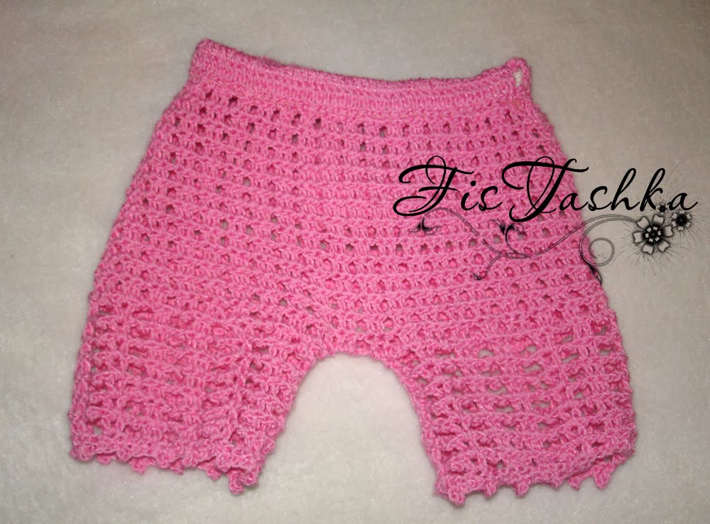 Для этого я делю петли задней части примерно на 4 части - 2 средние части - вяжу столбиками с накидом (по общей схеме шорт), а по бокам вяжу полустолбиками с накидом (т.е. делаю 2 ПСБ, 1 вп. и т.д.), и в начале и конце задней части шорт делаю по 2 сбн, таким образом мы получаем немного приподнятую заднюю часть шорт, за счет чего они не сползают.