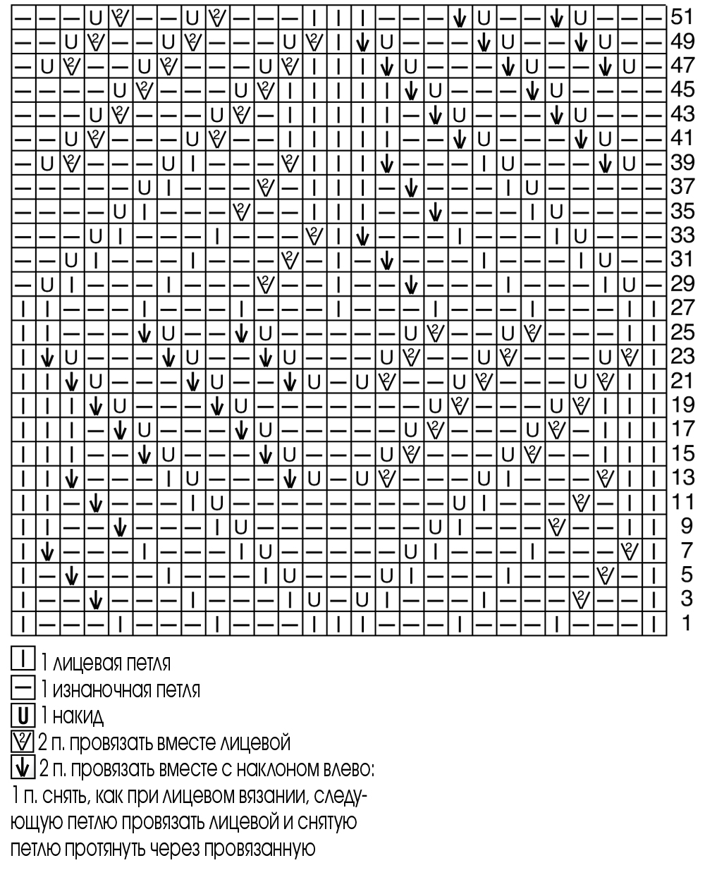Вязать по приведенной схеме. На схеме даны только лицевые ряды. В изнаночных рядах петли провязывать по рисунку, накиды — изнаночными. В высоту повторять с 1-го по 52-й ряд.