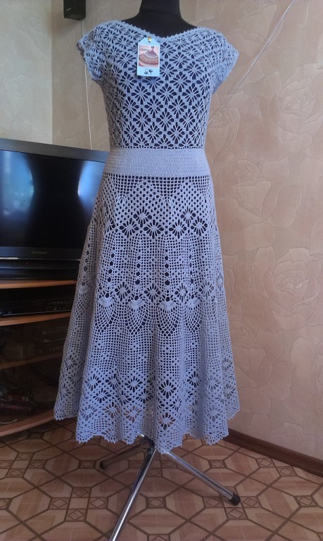 Платье выполнено в филейной технике , связано из смесовой нитки ,50/50 хлопок с акрилом , расход 400 гр ,800 м в 100 гр ,крючок 1,7 .