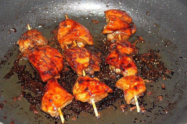 Далее насадить мясо на деревянные шпажки (опционально, можно просто поджарить на сковороде).