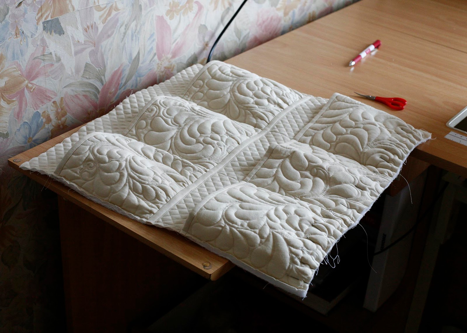 1. Выстегиваем квадрат из однотонной ткани. Я сделала перья. Размер итоговых кармашков 45*45 см. Из этой а-ля трапунто ткани будут сами кармашки.