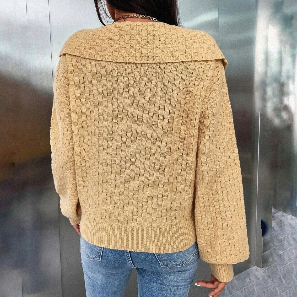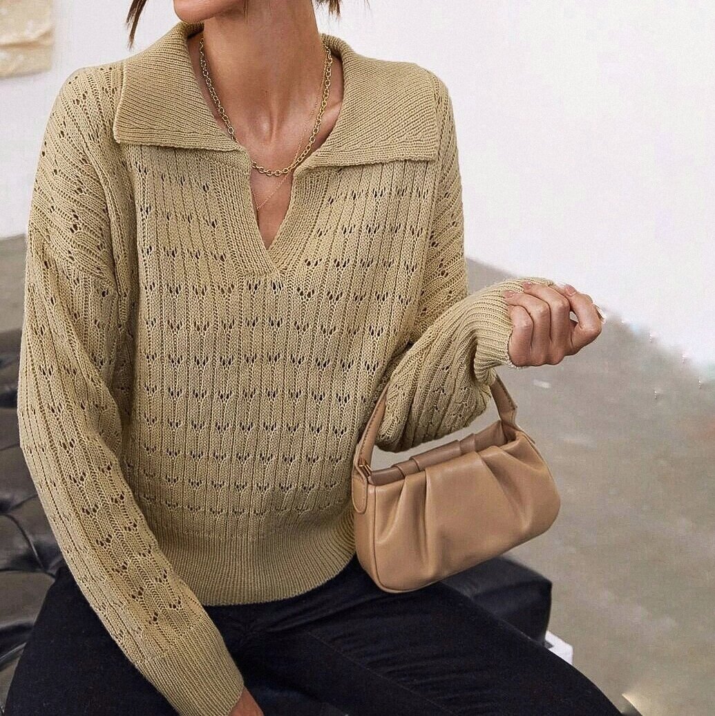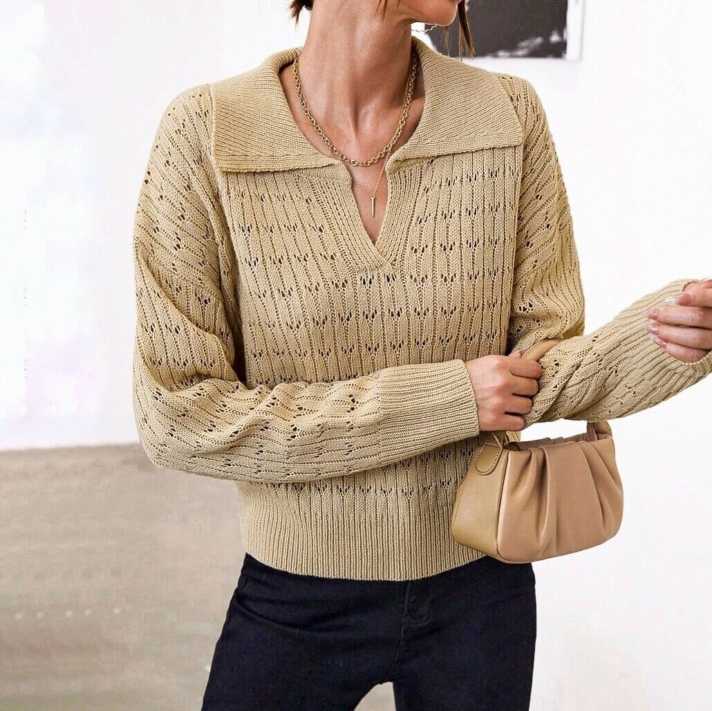 Первая модель — джемпер с цельновязаной планкой и широким отложным воротником. Вязаные модели с воротничками поло сейчас на пике своей актуальности.