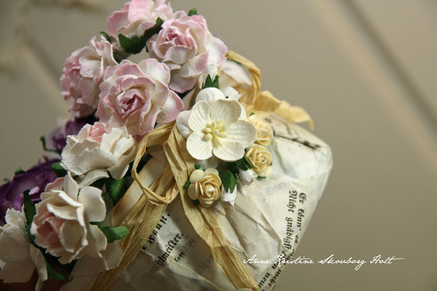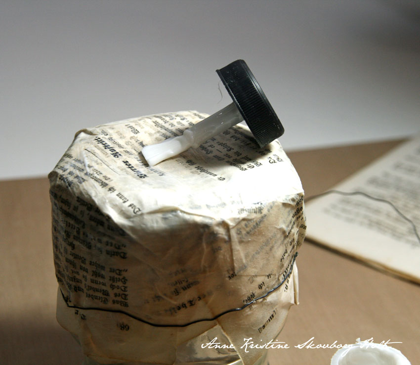 Оборачиваем бумагой баночку,закрепляем все проволокой и промазываем клеем,только не сильно обильно чтобы наши листы