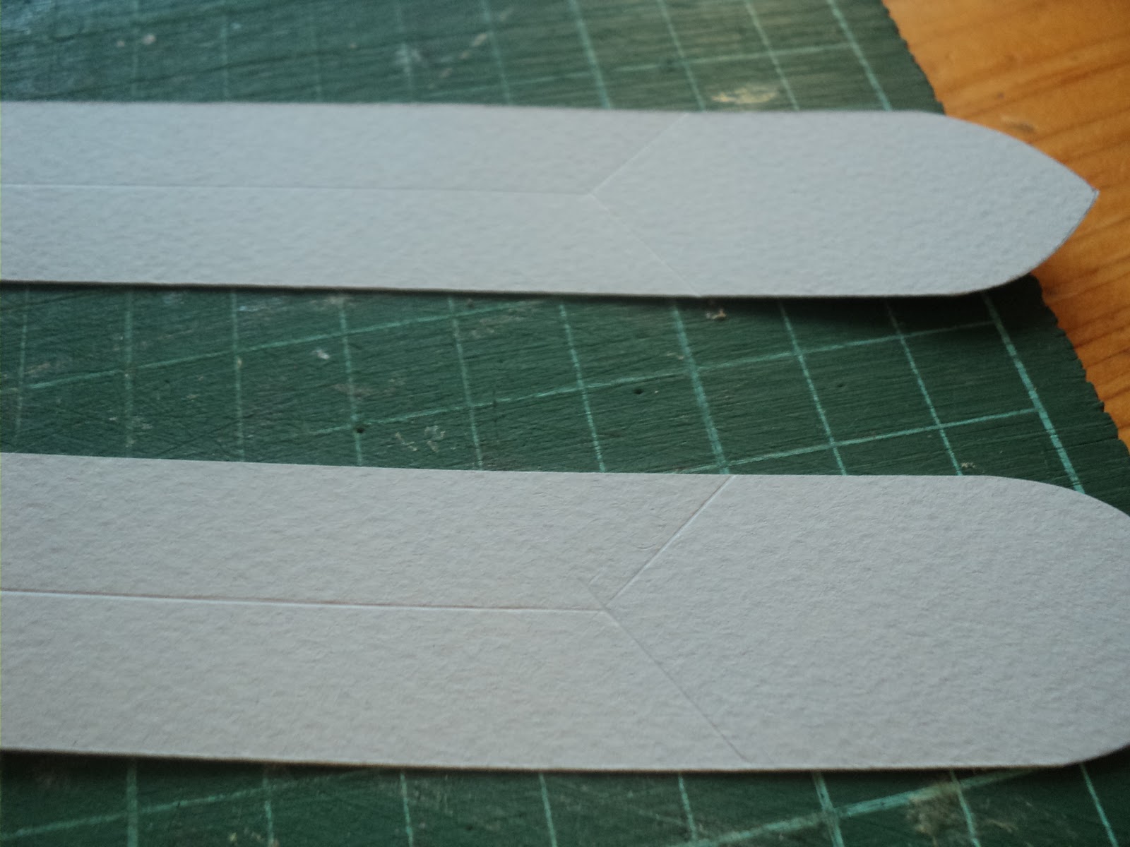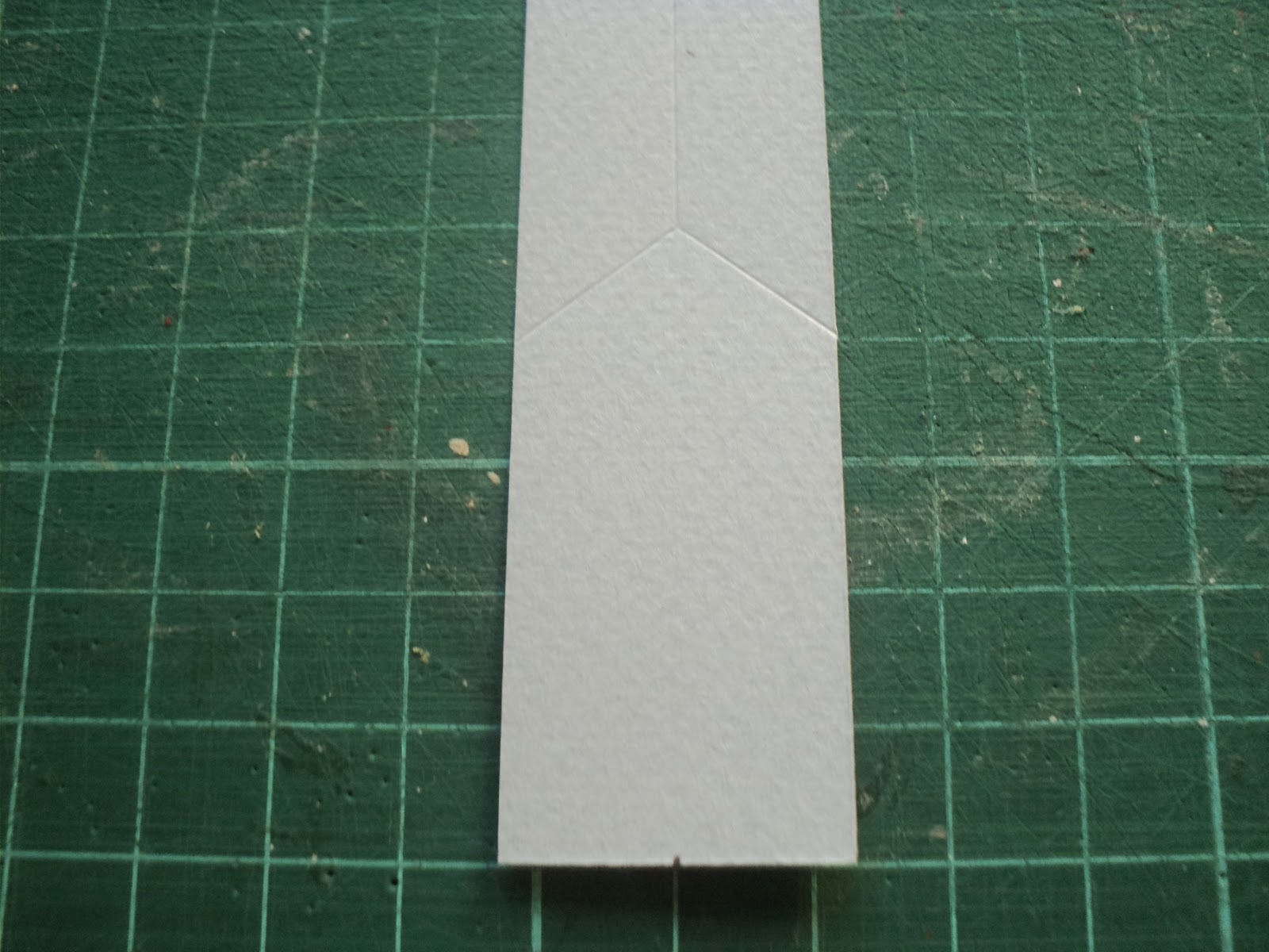 Сначала отрезаем вдоль длинной стороны листа две полоски шириной 2,5 см - это наши будущие ручки. Бигуем: проводим линию сгиба по центру полосы, при этом оставляя нетронутыми концы по 5 см от каждого края. От конца средней линии проводим еще две линии сгиба - такой "ласточкин хвостик" получается. Длина "хвостика" - 1 см.