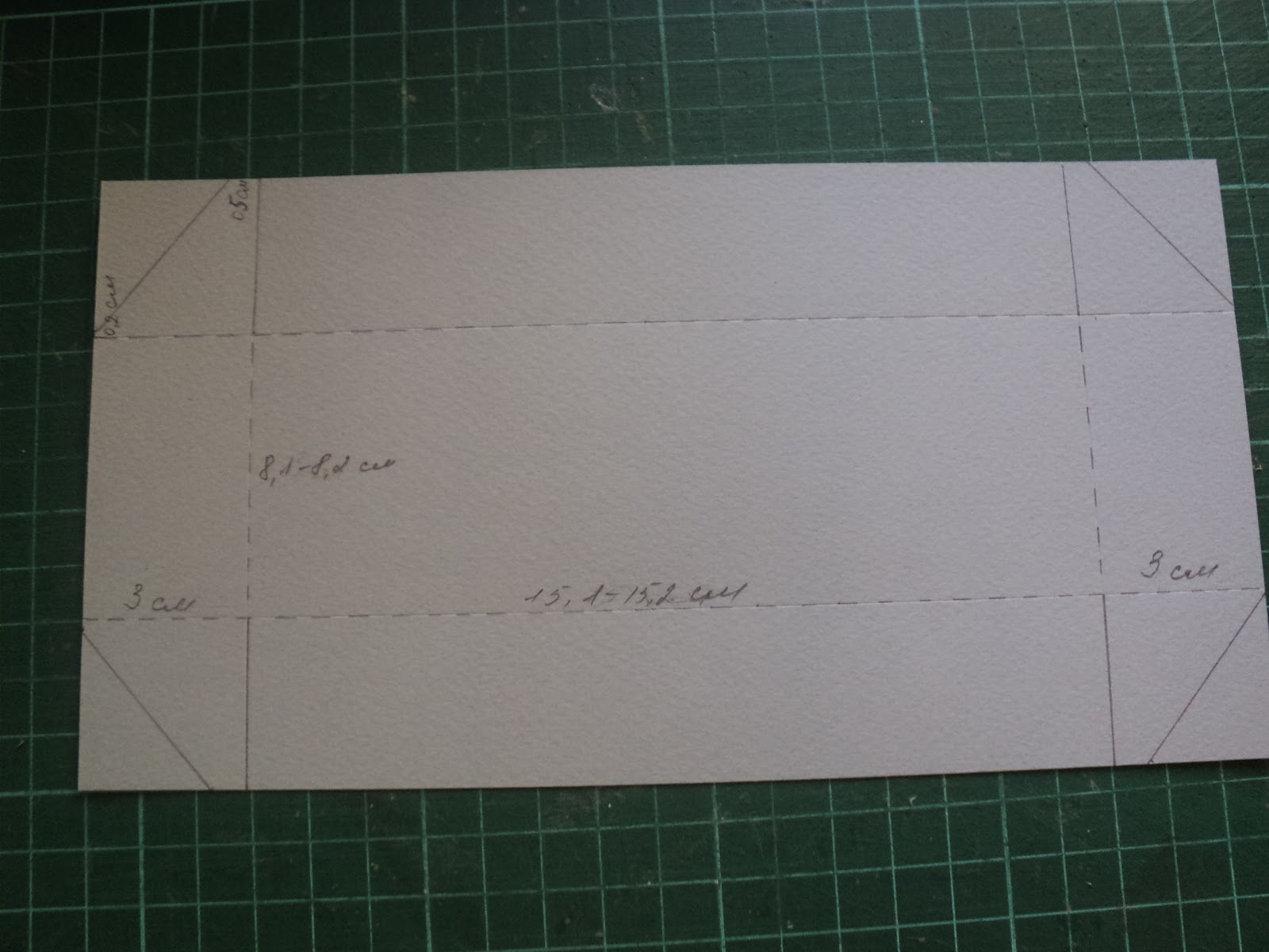 По длинной стороне откладываем: 2,5см, 15 см, 2,5 см и у нас остается 1 см. Здесь на всю высоту бигуем только последний 1 см. По остальным отметкам - делаем биговку на высоту примерно 5 см от линии сгиба дна, ниже линии дна делаем надрезы. К сожалению фото получилось не особо четким, но основную разметку на нем видно. По пунктиру - сгибаем, по сплошной линии - режем.