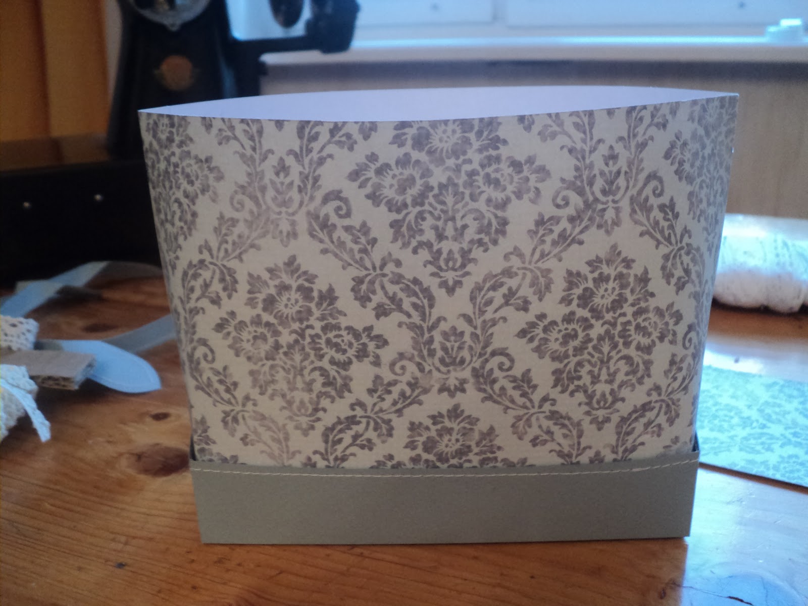 На фото видно, что нижняя часть пока не тронута, сделаны только надрезы. А теперь проработаем линии биговки. Не забывайте, что вертикальные линии у нас всего 5 см над горизонтальной чертой. Это важно для того, чтобы верхняя часть была "гладенькой", без ребер. Подгибаем (но не склеиваем) нижнюю часть, формируя донышко. Оно получается со щелью - ничего страшного, потом все закрывается.