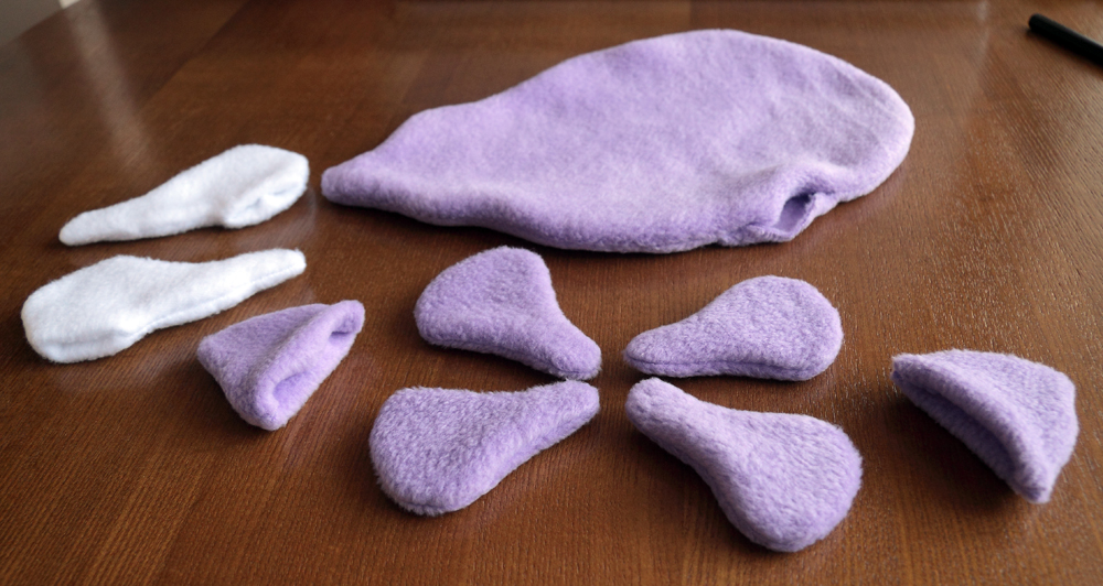 На теле оставляем дырку на пузике там, где это отмечено на выкройке, ушки и крылья не прошиваем с одной стороны (на выкройке обозначено прерывистой линией), ноги, ничего не боясь, полностью обстрачиваем по кругу.