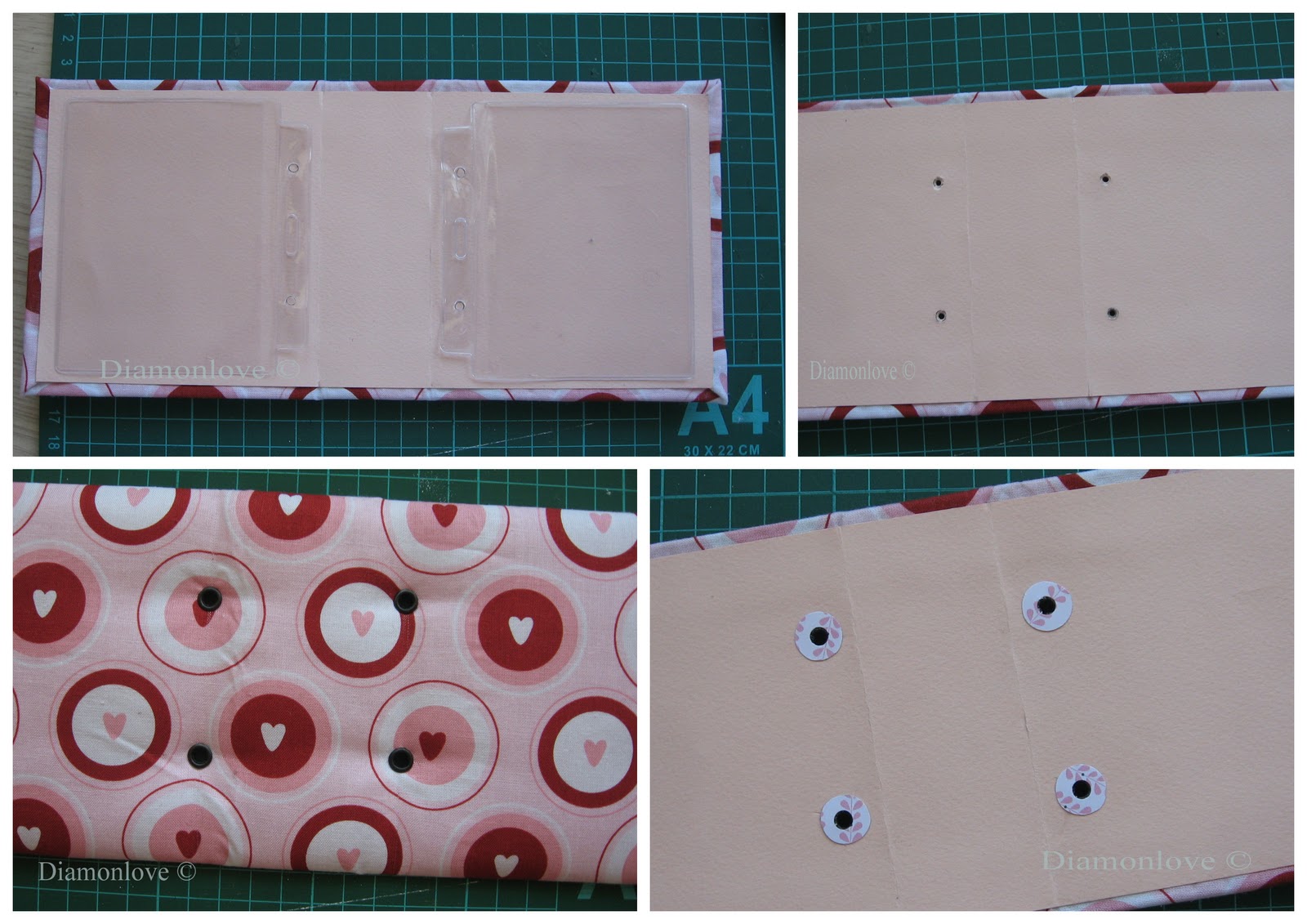 Берем два файлика и прикладываем их таким образом, как они у нас будут располагаться в альбоме с обеих сторон. Делаем разметку в тех местах, где у нас должны быть отверстия под крепление альбома. Дыроколим или делаем дырки шилом. У кого есть возможность, устанавливаем люверсы, а внутренние дырочки декорируем элементами скрывающие неровности :).