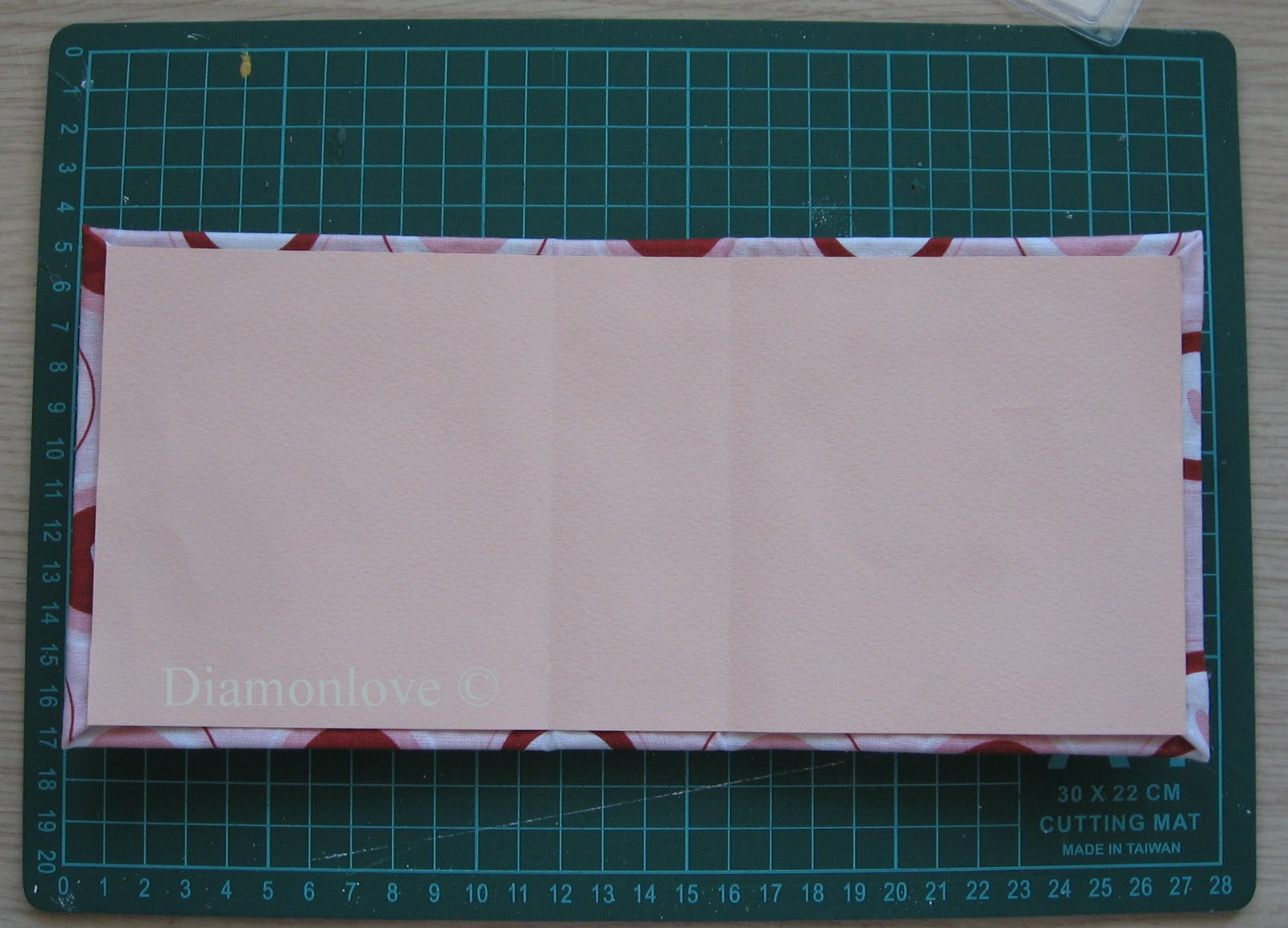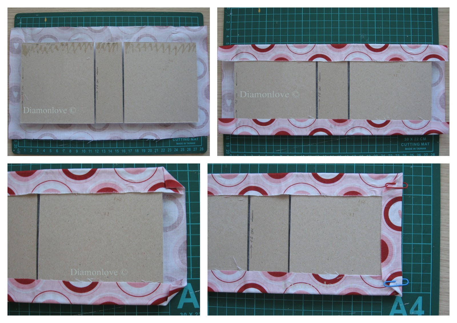 Далее приклеиваем ткань. Для склеивания я использую клей Момент Кристалл, поскольку он не оставляет значительных следов на ткани. Как показано на фото, наносим немного клея на верхнюю и нижнюю части наших картонок, и натягиваем ткань, хорошенько прижимая к картону. Можно это дело зафиксировать скрепочками. Теперь приступаем к склеиванию уголков и боковинок. Следуем инструкции на фото. Также фиксируем скрепками.