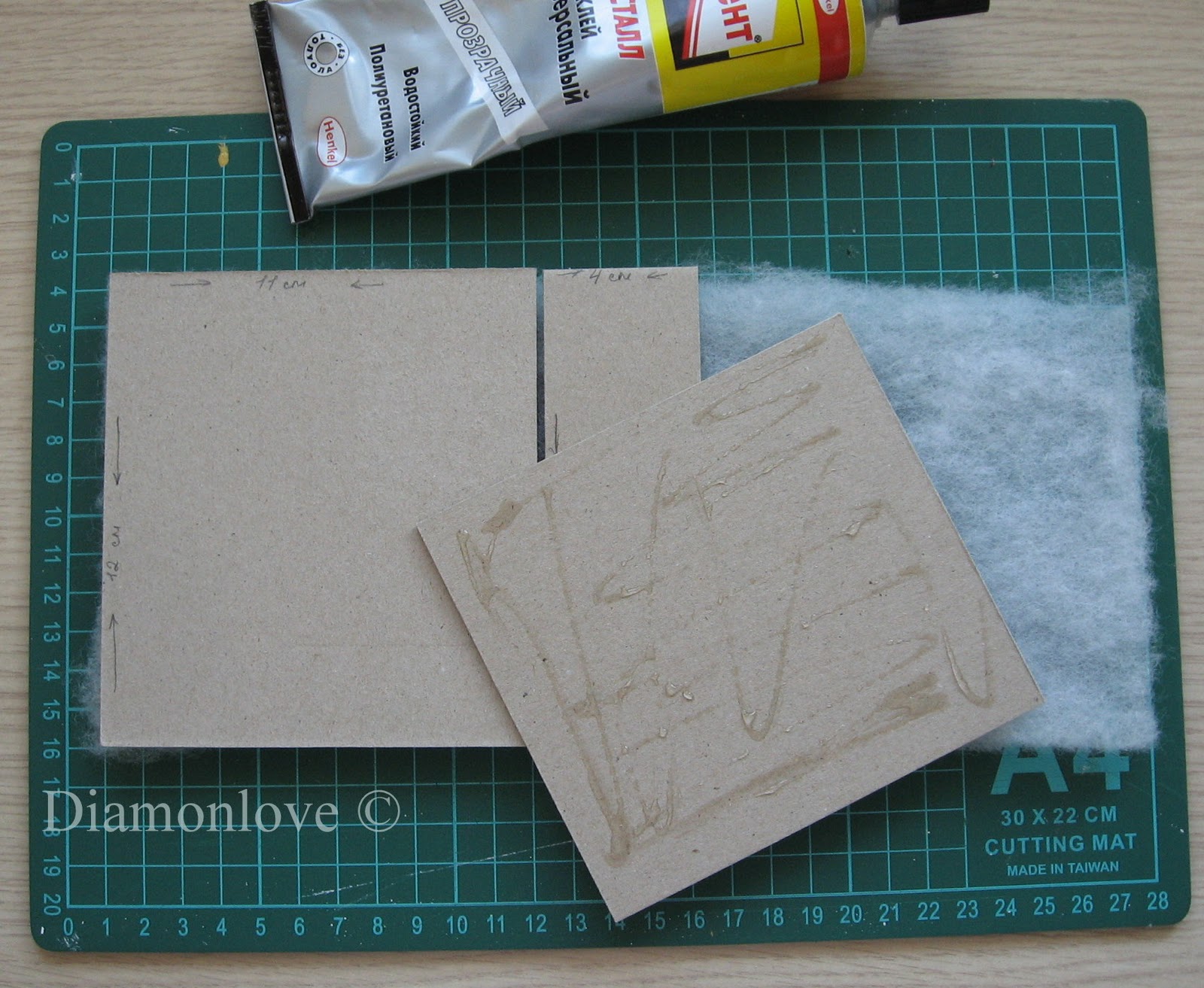Ну что ж, приступим к рабоме :). Для начала я немного наношу клея на наши картонные заготовки для альбома и приклеиваю их к флисе с отступами в 2-3 мм. Можно и не наносить на клей, я это делаю для того, что картонки не ездили, а немного зафиксировались.