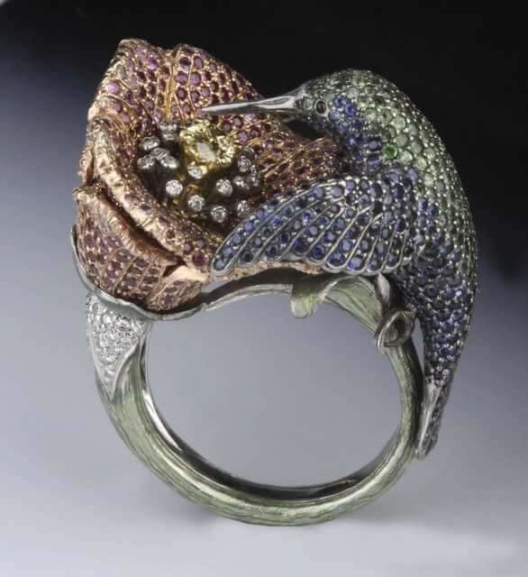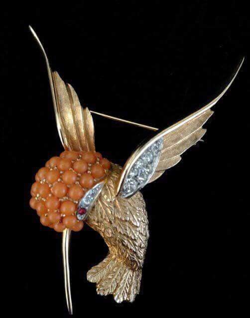 Некоторые из самых плодовитых создателей «пернатых» украшений– среди них Mauboussin и Marchak, а также Пьер Стерле, который работал с Boucheron, Van Cleef&Arpels, а затем, до своей смерти в 1978 году, был художественным директором Chaumet. У его творений есть несколько уникальных отличительных черт – приверженность экзотическим видам, использование необычных камней и минералов, например, зеленых сапфиров, кораллов, бирюзы, лабрадоритов, топазов, рубеллитов и т.д., а также применение техники «вязаного золота». Этот метод скручивания и плетения золотой проволоки позволил создать гораздо более тактильное и динамическое представление птичьего оперения.