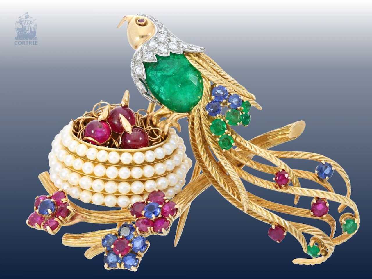 Среди представленных изделий были брошь-павлин от Mellerio dits Meller (ок. 1910 г.), брошь с экзотической птицей от Van Cleef & Arpels, украшенная бриллиантами, изумрудами, сапфирами, рубинами, ониксами и платиной (1924 г.) и брошь в виде павлина от Cartier с бриллиантами, сапфирами, рубинами, изумрудами из платины и желтого золота (ок. 1947 г.).