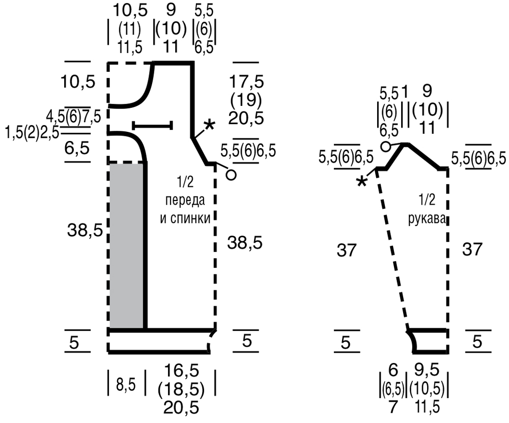 Через 38,5 cм = 112 р. от нижней планки петли для формирования пройм разделить, для этого последние 112 (120) 128 п. переда временно оставить, а на первых 102 (110) 118 п. спинки работу продолжить лицевой гладью. При этом в 1-м р. для формирования коротких регланных скосов закрыть с обеих сторон 1 раз по 3 п., затем в каждом 2-м р. сначала закрыть 1 раз по 2 п., затем убавить (см. «Декоративные убавки») 6 (7) 8 раз по 1 п. = на спицах 80 (86) 92 п. Далее вязать прямо без убавок.