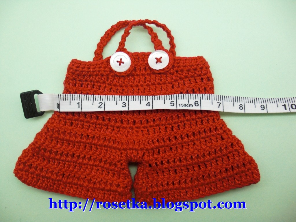 Для этого присоединяем нить к задней части штанишек, ориентировочно к 8-му по счету столбику от бокового шва.