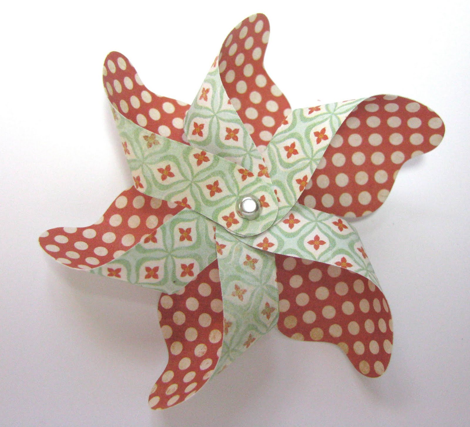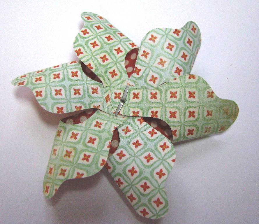 [показать][показать]Then, in order one by one start bringing over the opposite sides of the petals and secure onto your brad. We are basically working backwards, so you will be seeing your pinwheel from the back at this point.[показать]When each petal has been folded over, secure your brad closed. You may see something that looks like this: