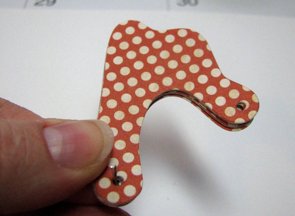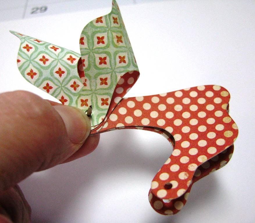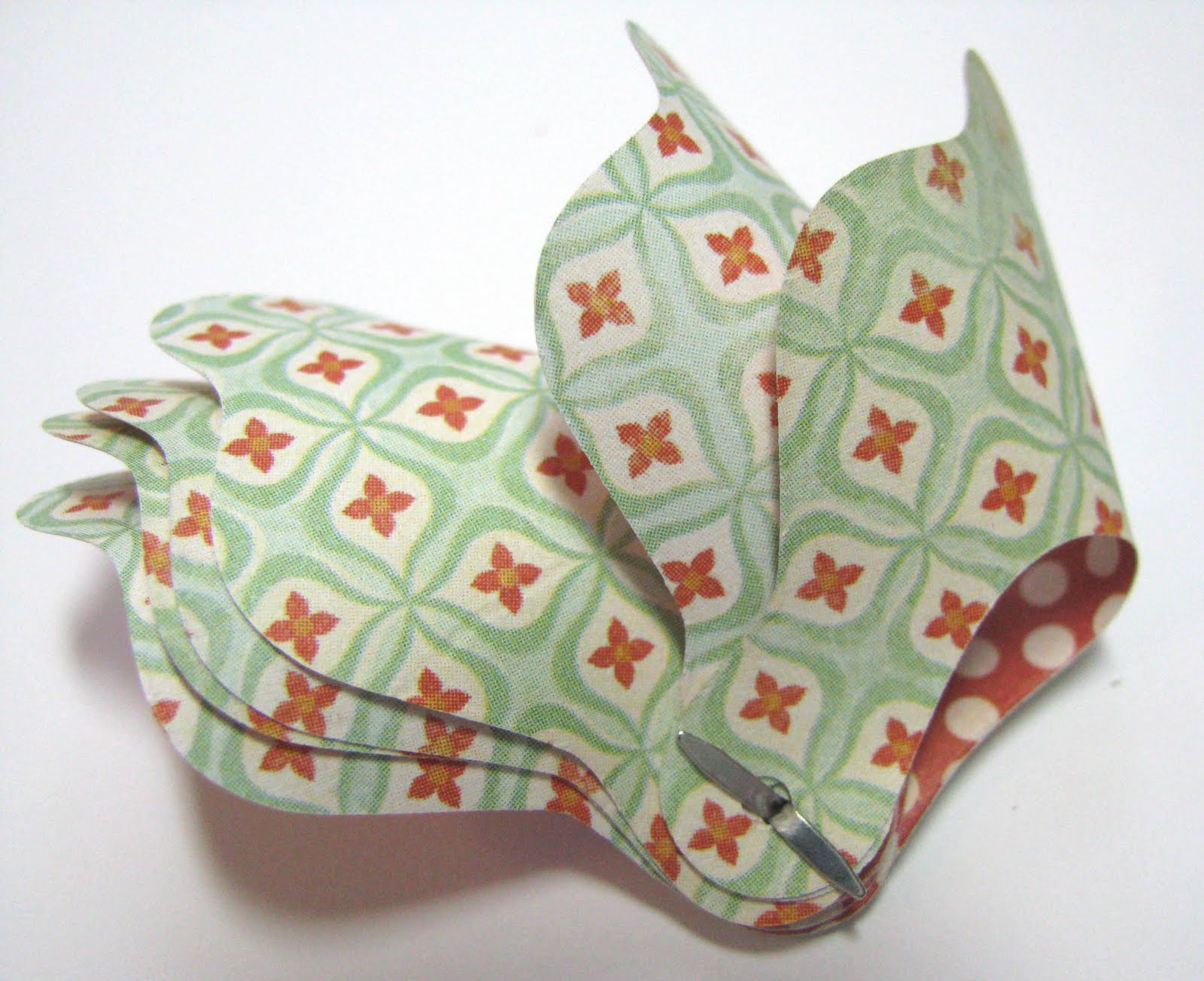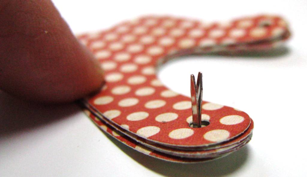 After all your petals are cut, stack them all on top of each other and insert your brad into the hole on the longer, straighter edge of the die cut so that the *head* is on the opposite side and the *stem* is poking up through the stack and facing you.