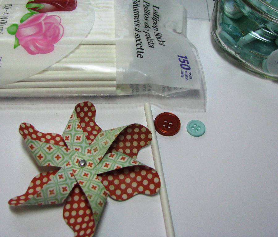 Tools you will need: Pinwheel Die, die cutting machine, one brad (the longer the *stem* the better) Optional: glue dots, lollipop stick, embellishments