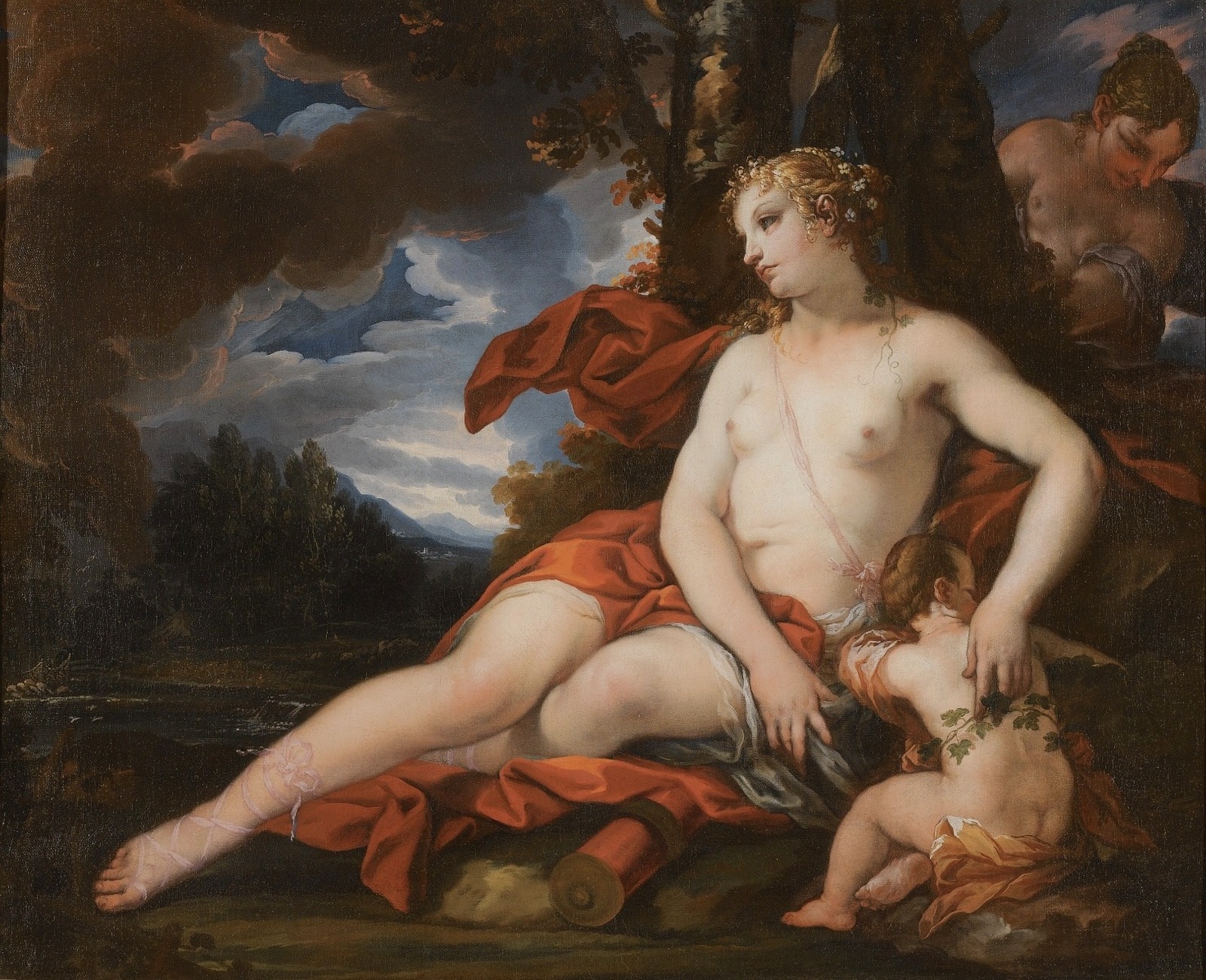 Венецианская школа (Venetian School), XVII век_Венера с путти и нимфой на берегу (A Goddess, Possibly Venus, Sitting By A River With A Putto And A Nymph)_79 х 98_х.,м._Частное собрание