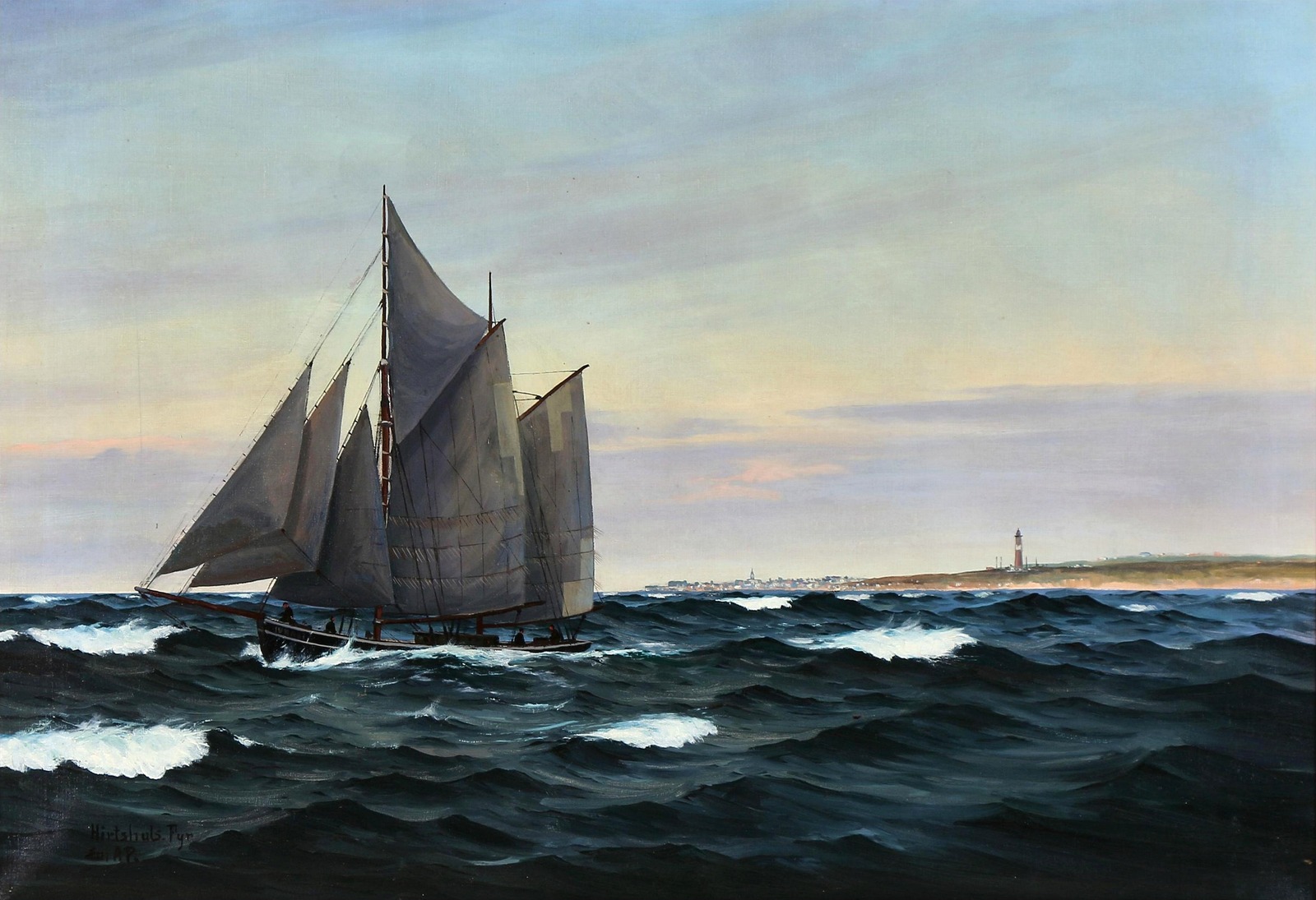 Парусный корабль в море у маяка Хиртсхальса (Sailing ship at sea off the Hirtshals Lighthouse)_67 х 99_х.,м._Частное собрание