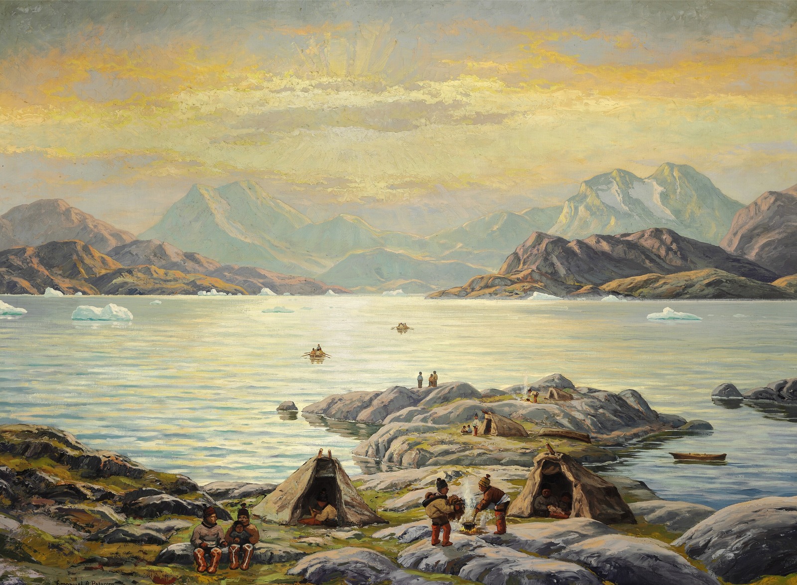 Летний день в гренландском фьорде (Summer day at a Greenlandic fiord with women preparing food over open fire)_120 х 160_х.,м._Частное собрание