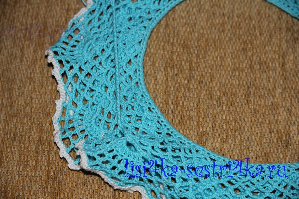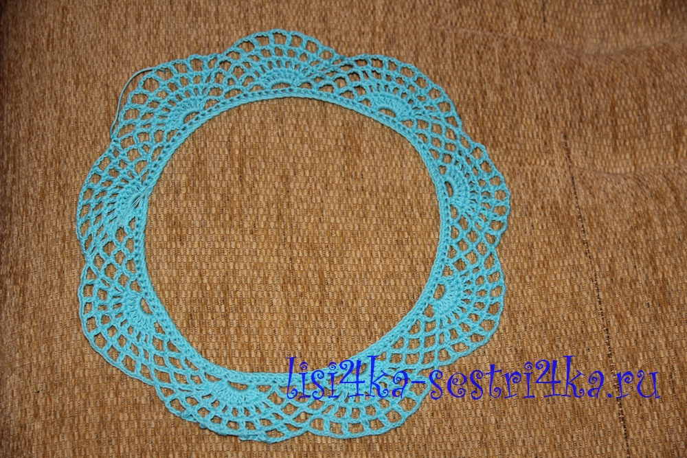 [показать]Дальше переходим ко второй оборке. Для этого необходимо связаться первый ряд из арочек воздушных петель под вторым рядом первой Оборки. Кокетка вяжется с увеличением в каждой оборке по одному мотиву. Для того, чтобы добавить один мотив необходимо увеличить количество арочек в первом ряду оборки на пять. Увеличение происходит через каждые четыре арочки. Для этого вместо пятой арочки провязываем пятую и шестую в одну арочку.