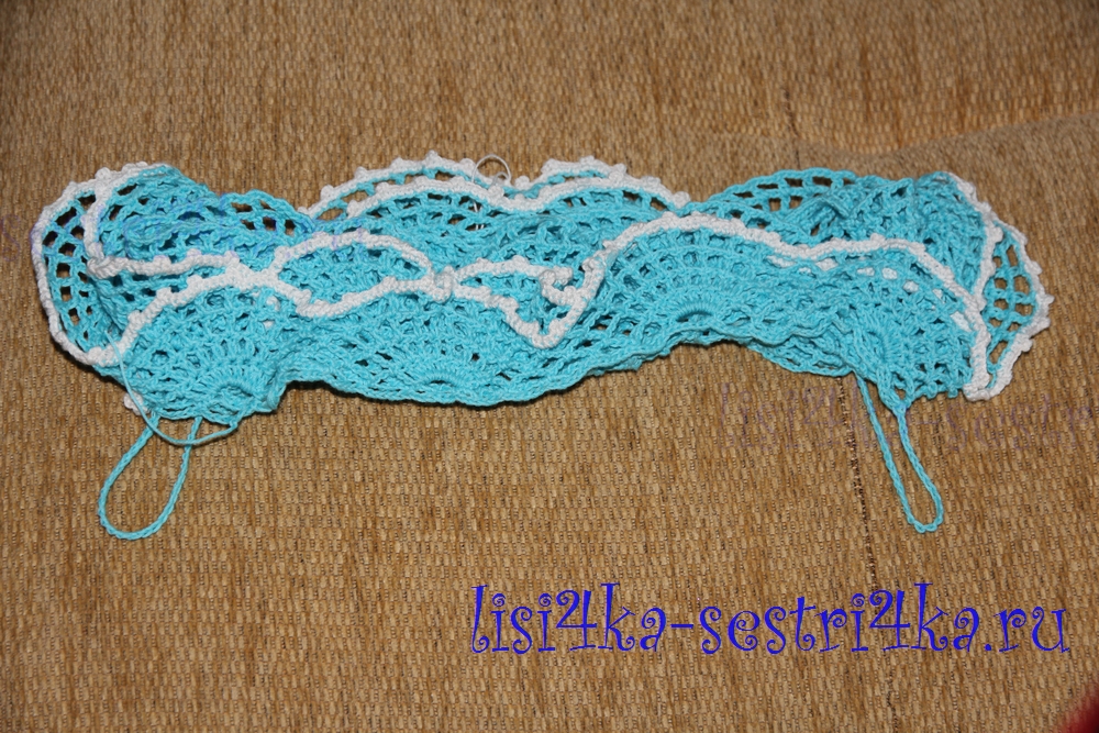 Для того, чтобы перейти к вязанию первой оборки необходимо увеличить количество арочек в первом ряду оборки. Увеличение производим так же, как и при вязании кокетки, равномерно - через каждые четыре арочки.