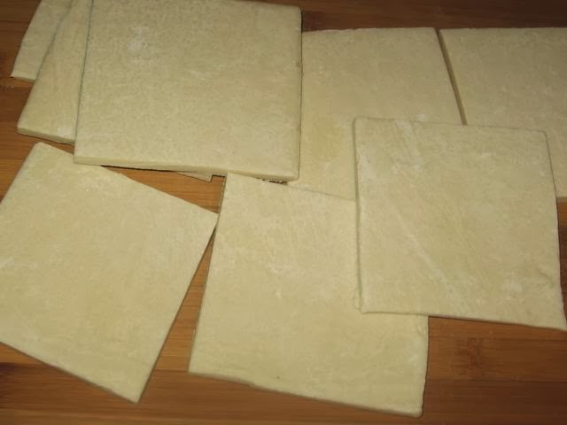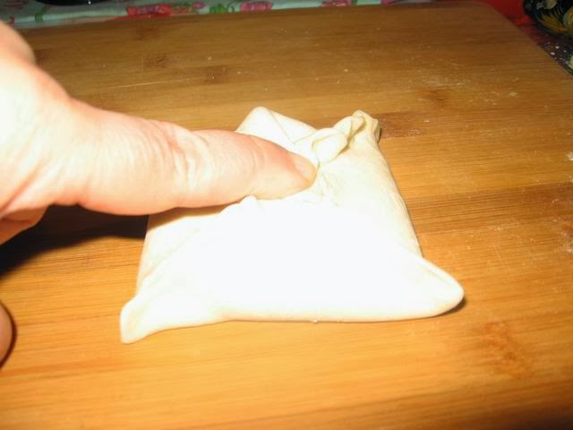 Никаких особых сложностей нет! Надо раскатать каждый квадрат, чтоб он увеличился примерно вдвое - чтоб поместился кусочек яблока. Вот почему я и заметила, что можно просто яблоки нарезать кусочками. Тогда проблем меньше будет с формированием слойки.