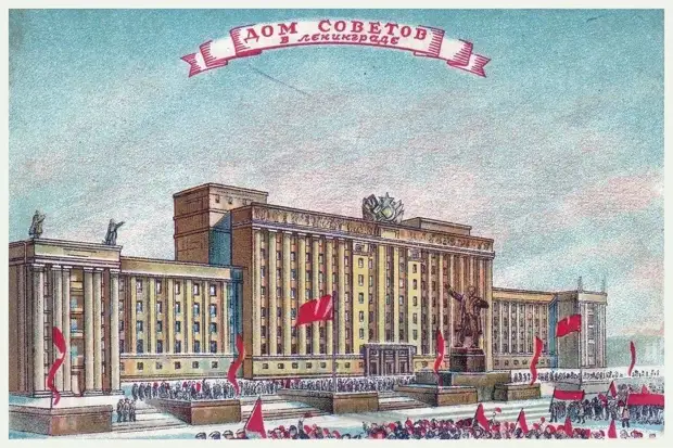 Открытка «Дом Советов в Ленинграде», предположительно, 1939 год. Тираж составлял 50000 экземпляров. Художник — В.М. Максимов, цена 15 копеек.