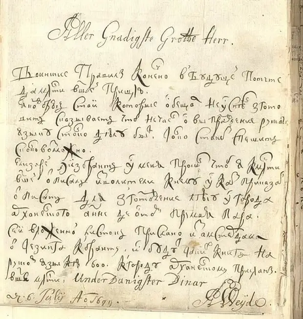Но зато вскоре отлично показал себя в сражениях на севере. В 1714 Веде вместе с 7 пехотными и 2 драгунскими полками был послан в Финляндию. Но проявил себя не на суше, а на… море. Во время Гангутского сражения именно Вейде командовал галерой Петра. После той славной баталии, первой русской победы в морском сражении, царь наградил генерала орденом Андрея Первозванного – более высокого отличия в России не было.Письмо А. А. Вейде Петру I. Предоставлено РГАДА.