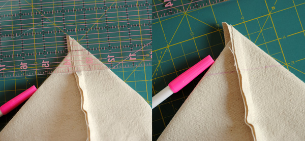 13. Добавить 1 1/2 "клиньев в отношении и внешних сумку и подкладку сумки нижнем углах.