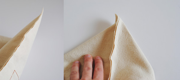положите руку в угол и сгладить угол в треугольнике с шов, в центре.