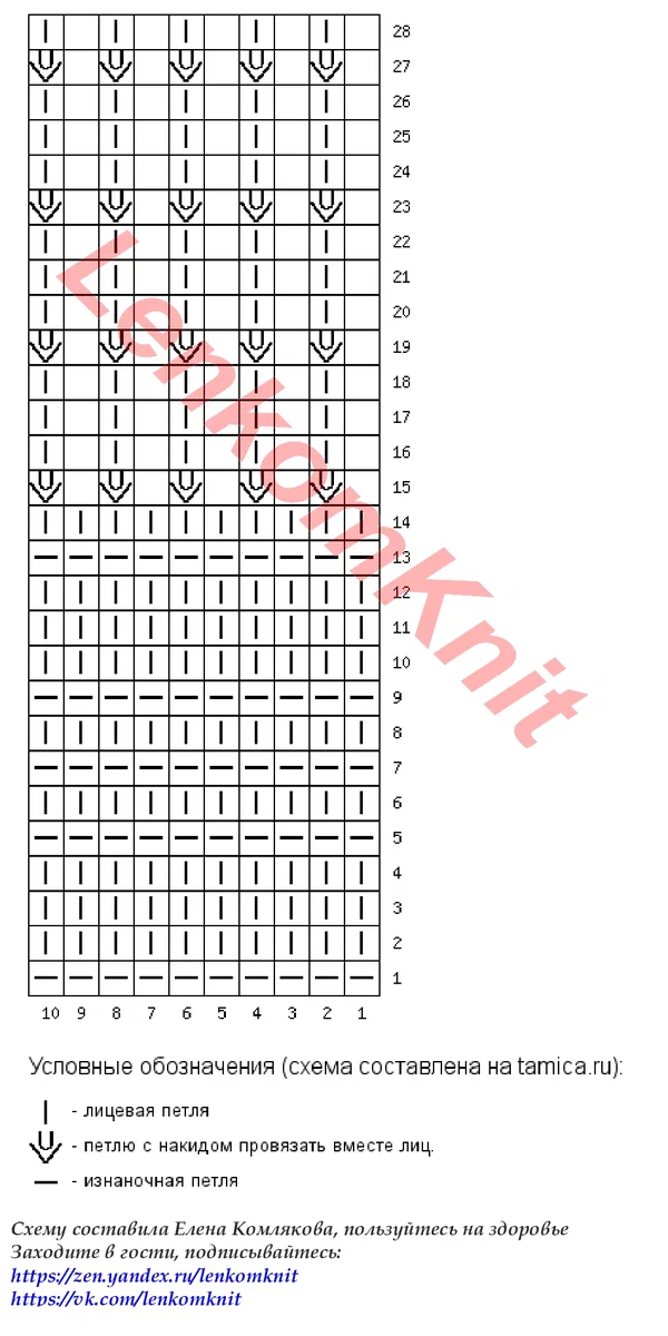 На рисунке — схема узора (для лицевых и изнаночных рядов). Раппорт — 28 петель в высоту и всего одна петля в ширину. Каждая полоса в этом свитере — по 14 петель. В резинке петля с накидом может провязываться просто заведением спицы в петлю предыдущего ряда (провязываем лицевой сразу обе петли)