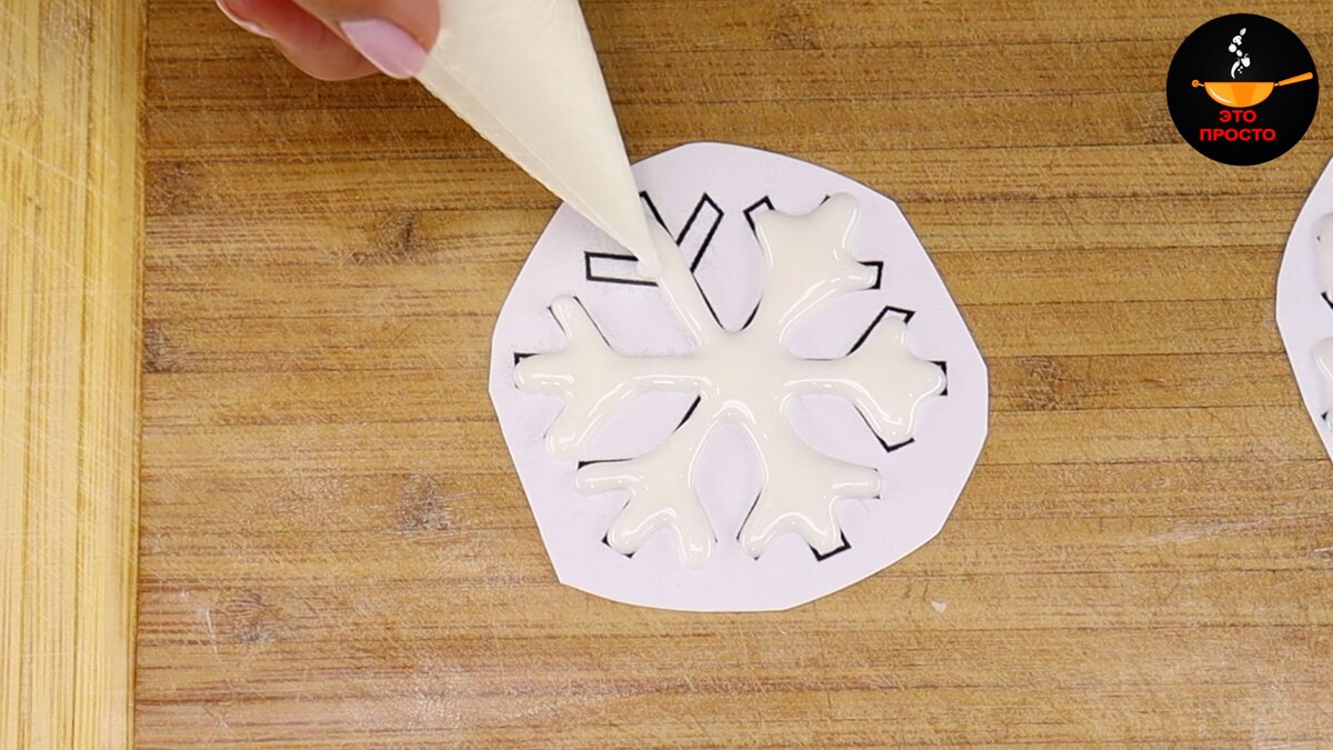 Белковую глазурь переливаем в кондитерский мешок и отрезаем уголок, но так, чтобы глазурь текла тонкой струйкой. Ещё важный момент, на который стоит обратить внимание, рисуем линии не сильно тонкие, иначе снежинки будут очень хрупкими и ломкими.