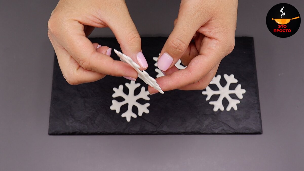 Я советую крепить снежинки или на мастику, или на шоколад. Они дольше сохранят свою форму и не растают.
