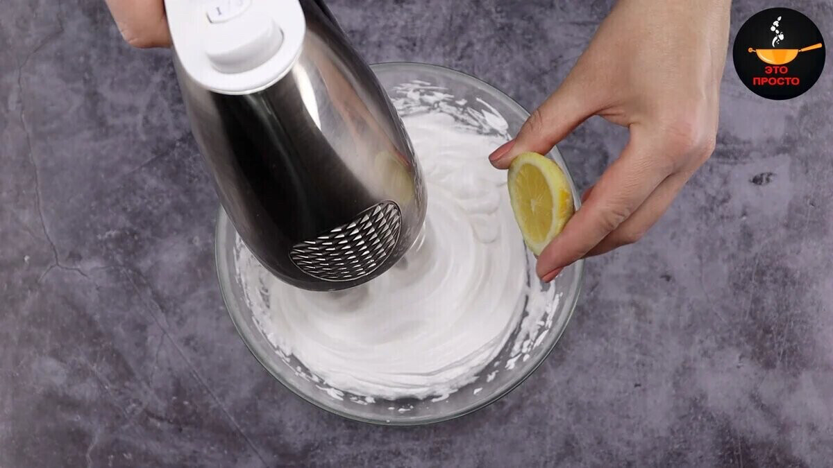 Белки взбиваем до появления лёгкой пены, добавляем несколько капель лимонного сока, а уже после, в несколько этапов, добавляем сахарную пудру.