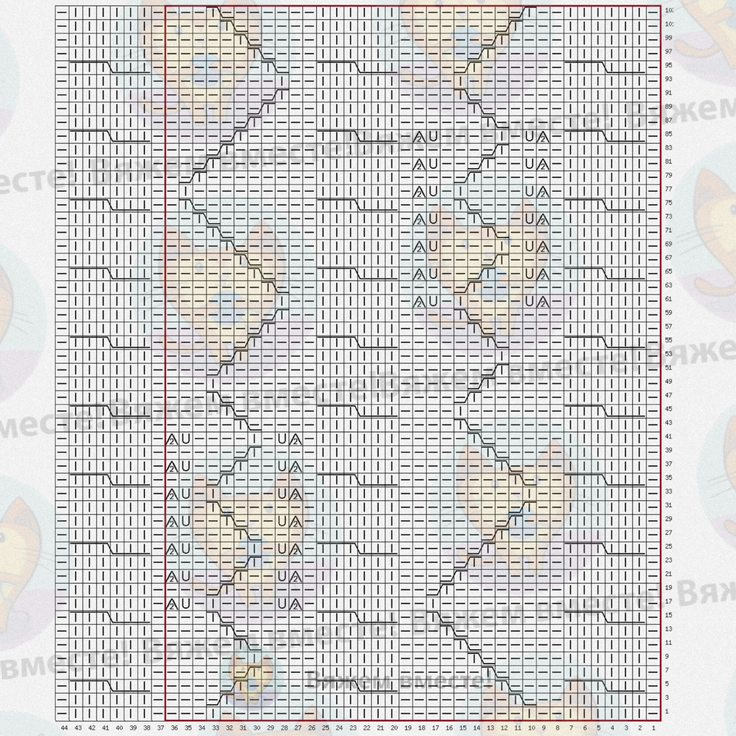 Схема получилась довольно масштабной, но совсем не сложной. Один раппорт узора равен 36 петлям по ширине и 104 рядам по высоте. Схема составлена приблизительно, но максимально близка к оригиналу. Обратите внимание на вертикальные жгуты, перекрещивания выполняются в каждом девятом ряду.