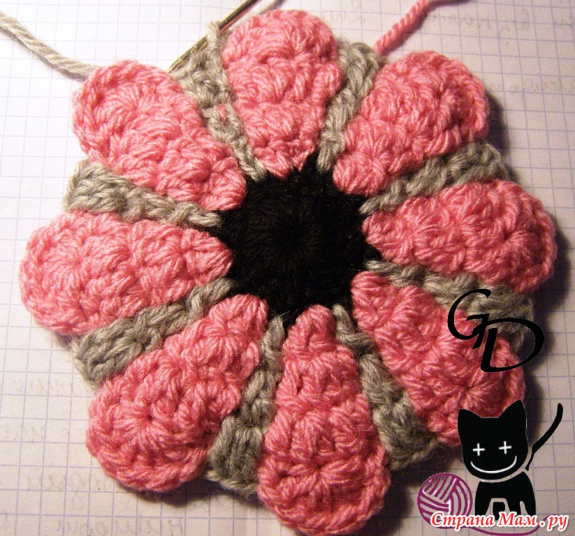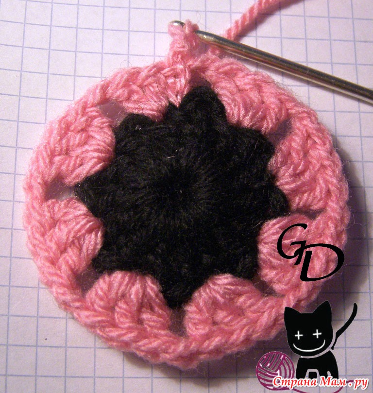 3 розовый. в один столбик с накидом - 3 столбика с накидом, 1 воздушная петля, (пропускаем один столбик с накидом)