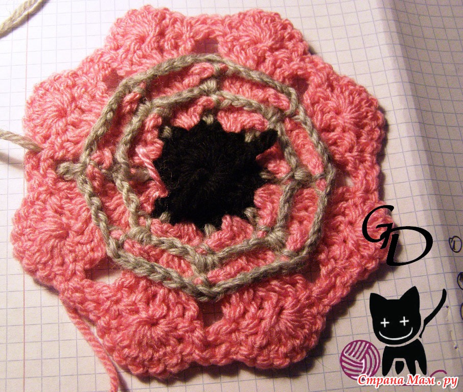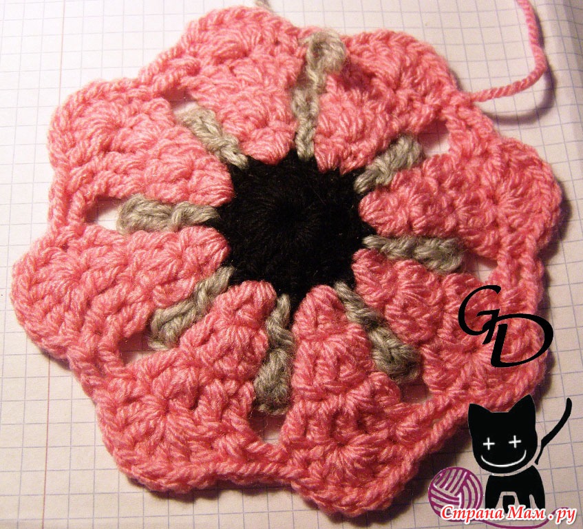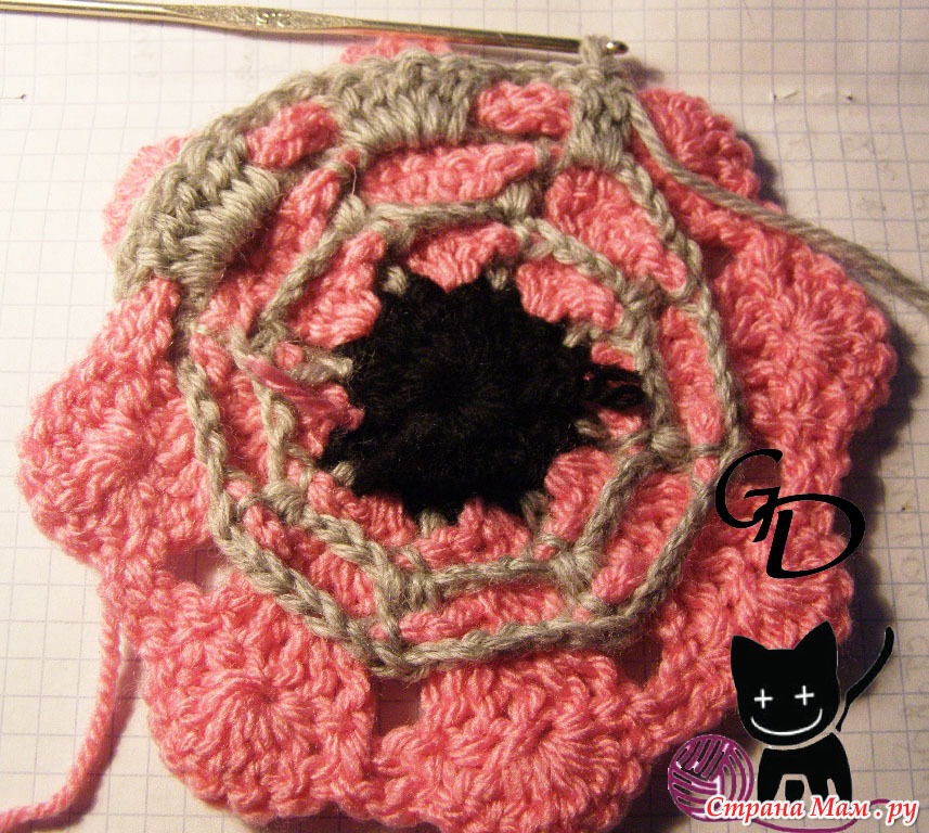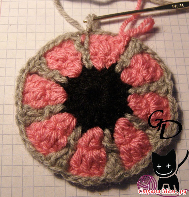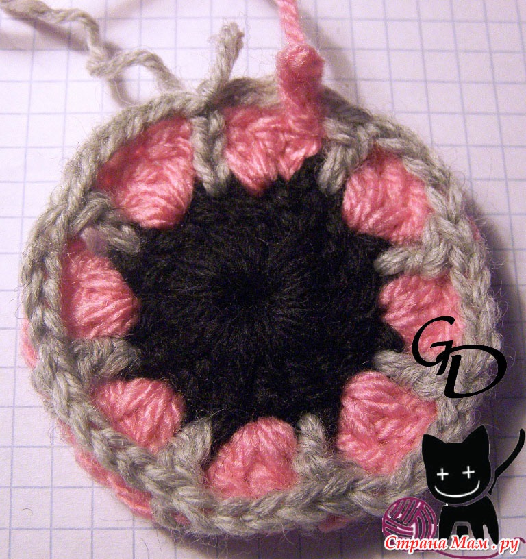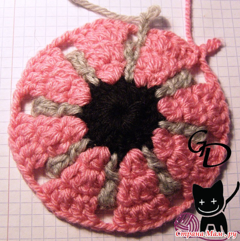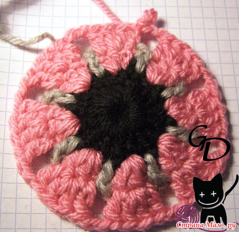 6 серый: 3 столбика с накидом в преждние 2 серых столбика, 5 столбиков с накидом за цепочку из 5 в. петель (4 серого ряда)