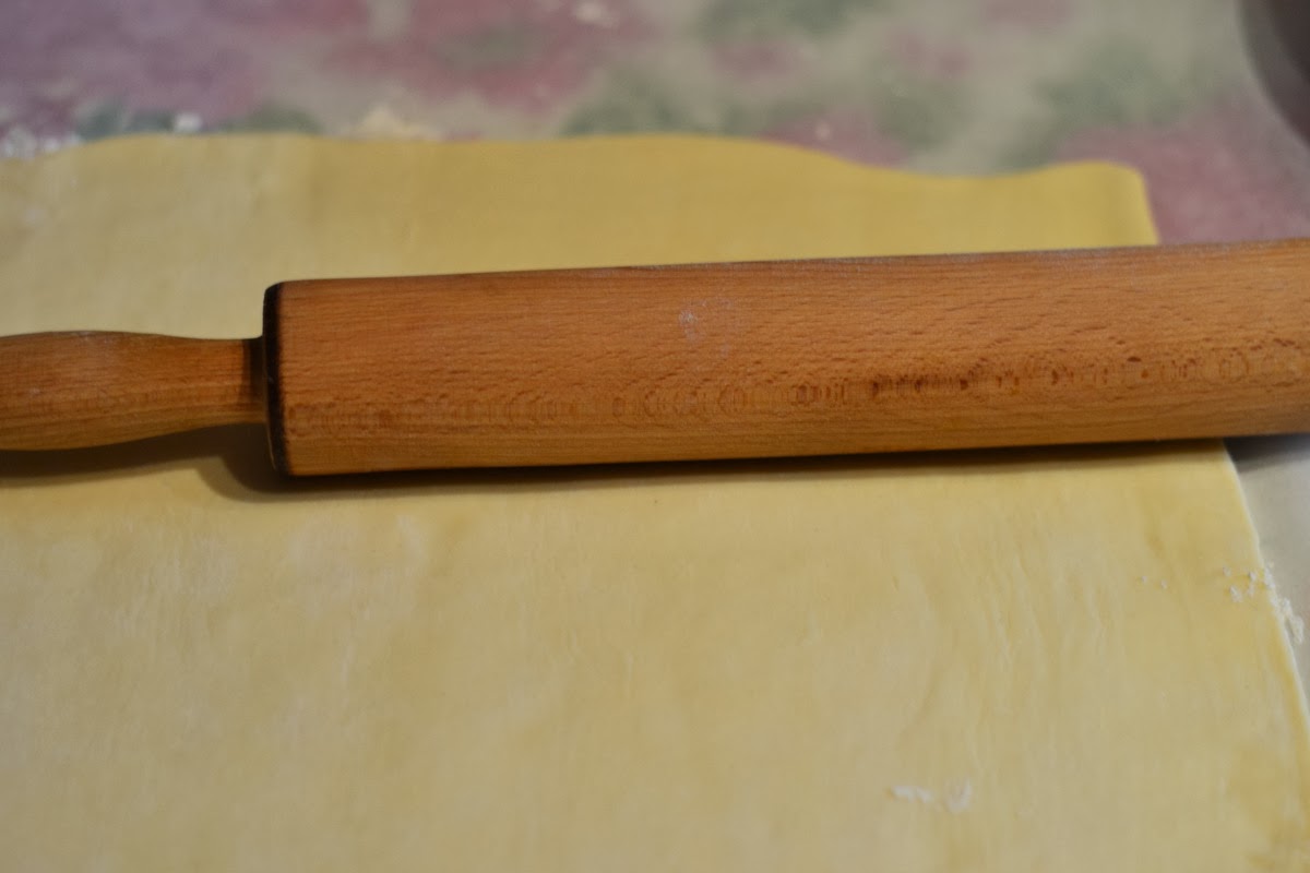 Готовое слоеное тесто на присыпанной мукой рабочей поверхности раскатываем в прямоугольник .