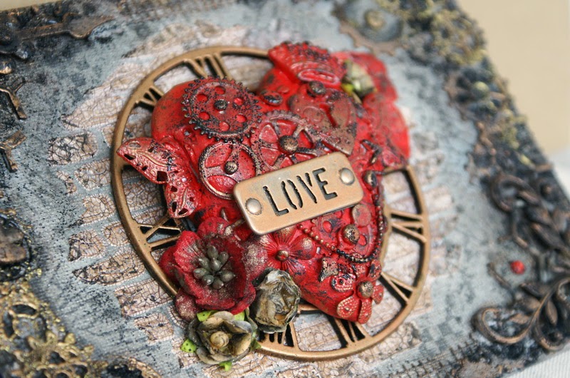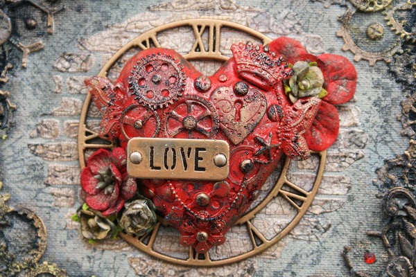 Крепим главный декоративный элемент в центр холста, который нужно обязательно прочно закрепить, так как сердце довольно тяжелое). Детально рассмотреть декор самого сердца можно по фото ниже. Там ничего особенного - покрыла красным акрилом, создала эффект потертости с помощью черного акрила, эмбоссинга и металлического воска.