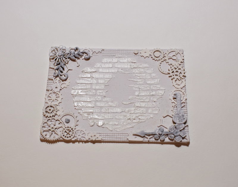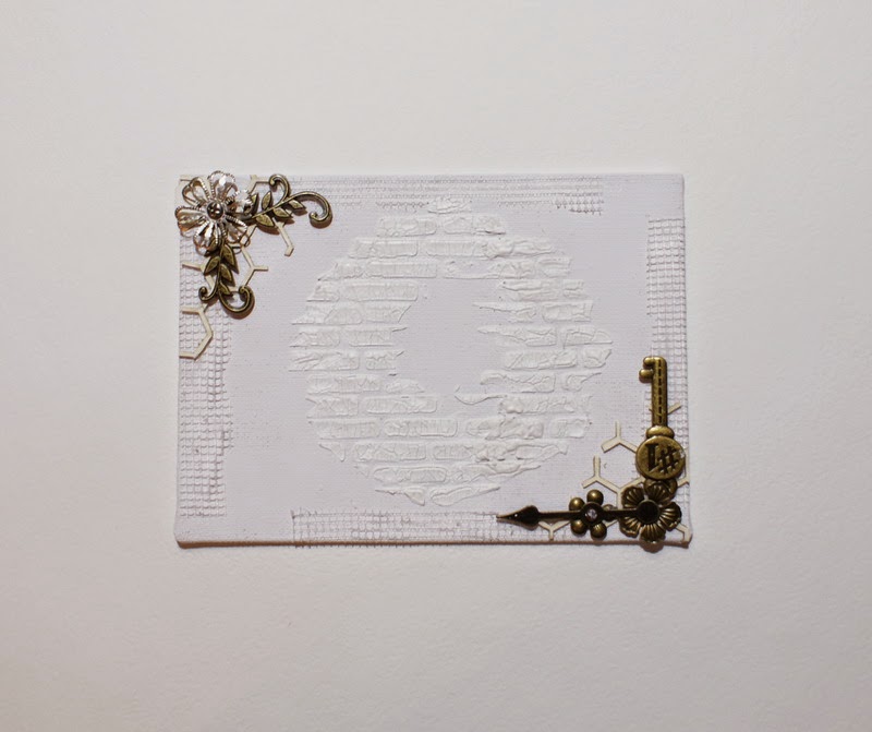 Начинаем декорировать холст, делаем раскладку элементов. Использовала кракелюрную текстурную пасту STUDIO 490, металлические элементы, чипборд"соты", сетку...
