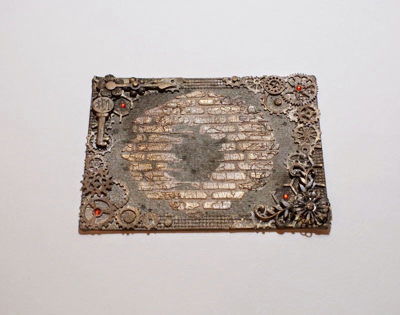 ...но мне не хватало яркости и контраста, поэтому после длительного эмбоссинга черной и золотой пудрой, получился окончательный вариант. Вы заметили, что появился еще штампинг замечательными резиновыми штампами от Тима Хольтца. Все это придало работе глубину. Также использовала металлический воск в цвете бронза и вот, что получилось...