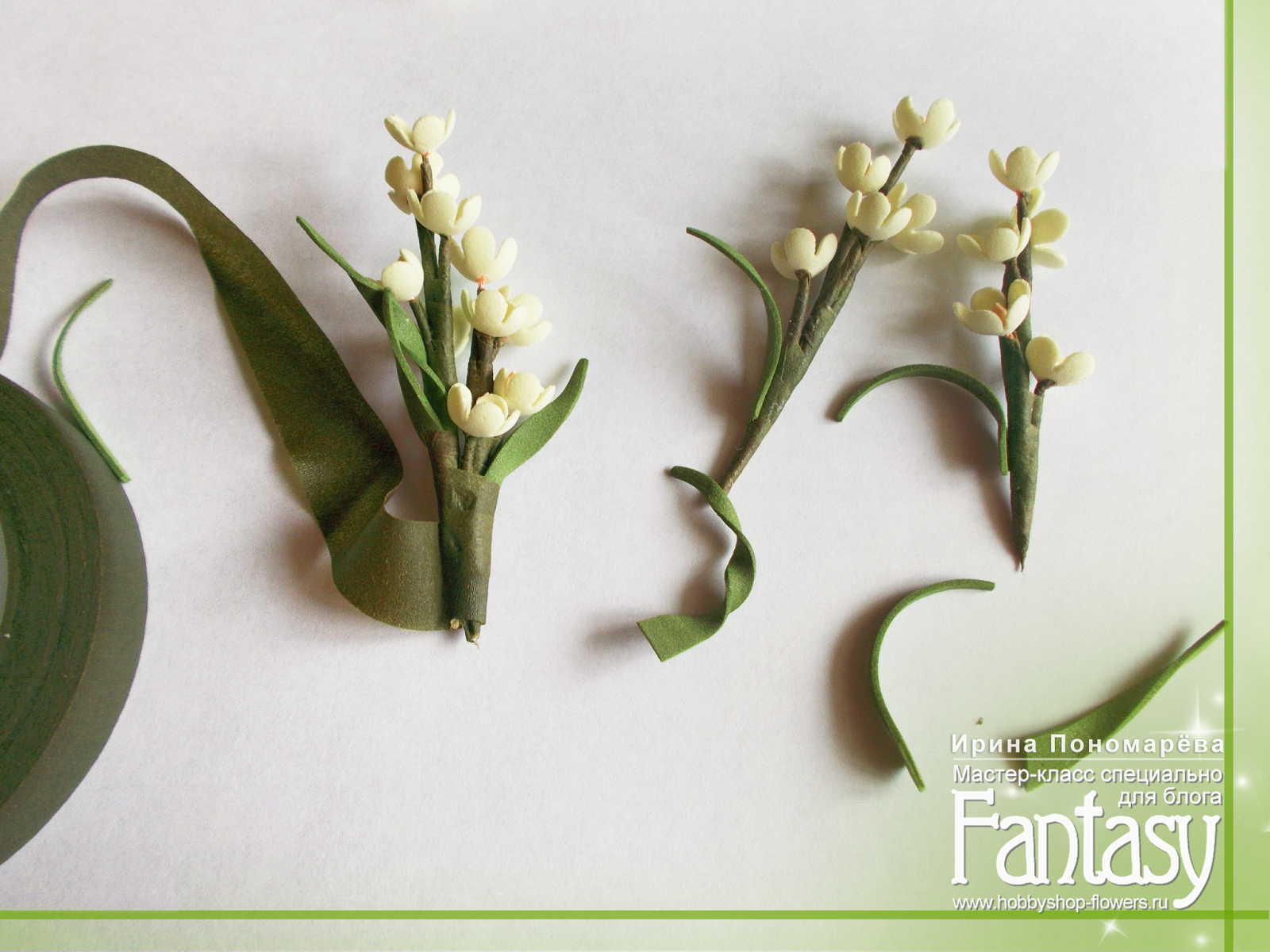 з обрезков зеленого фоамирана вырезаю клиньями листочки, нагреваю их на утюге и немного закручиваю, пока они горячие.