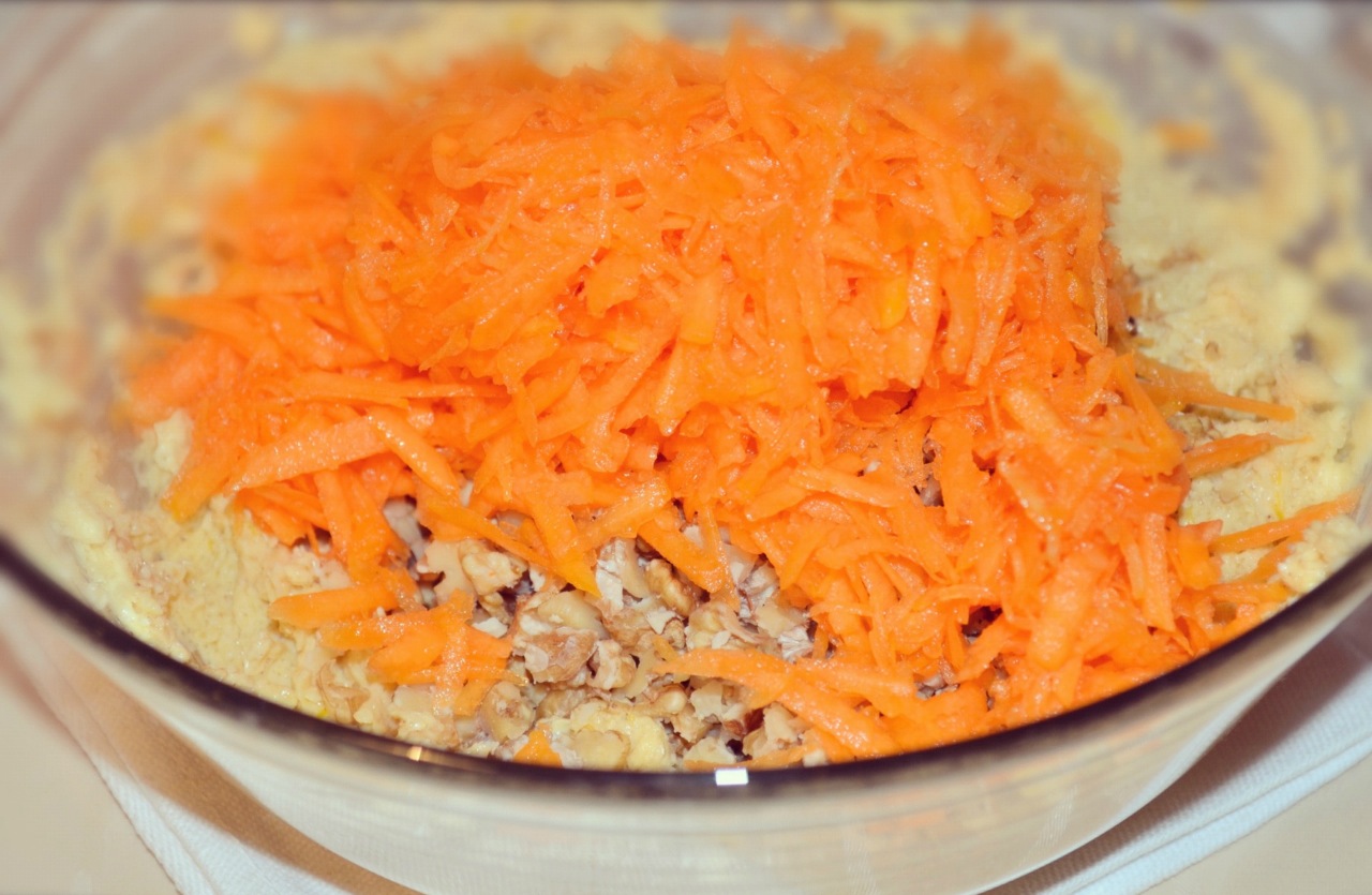 Прибавьте орехи, цедру и тыкву к взбитой ранее массе. Все хорошо перемешайте.